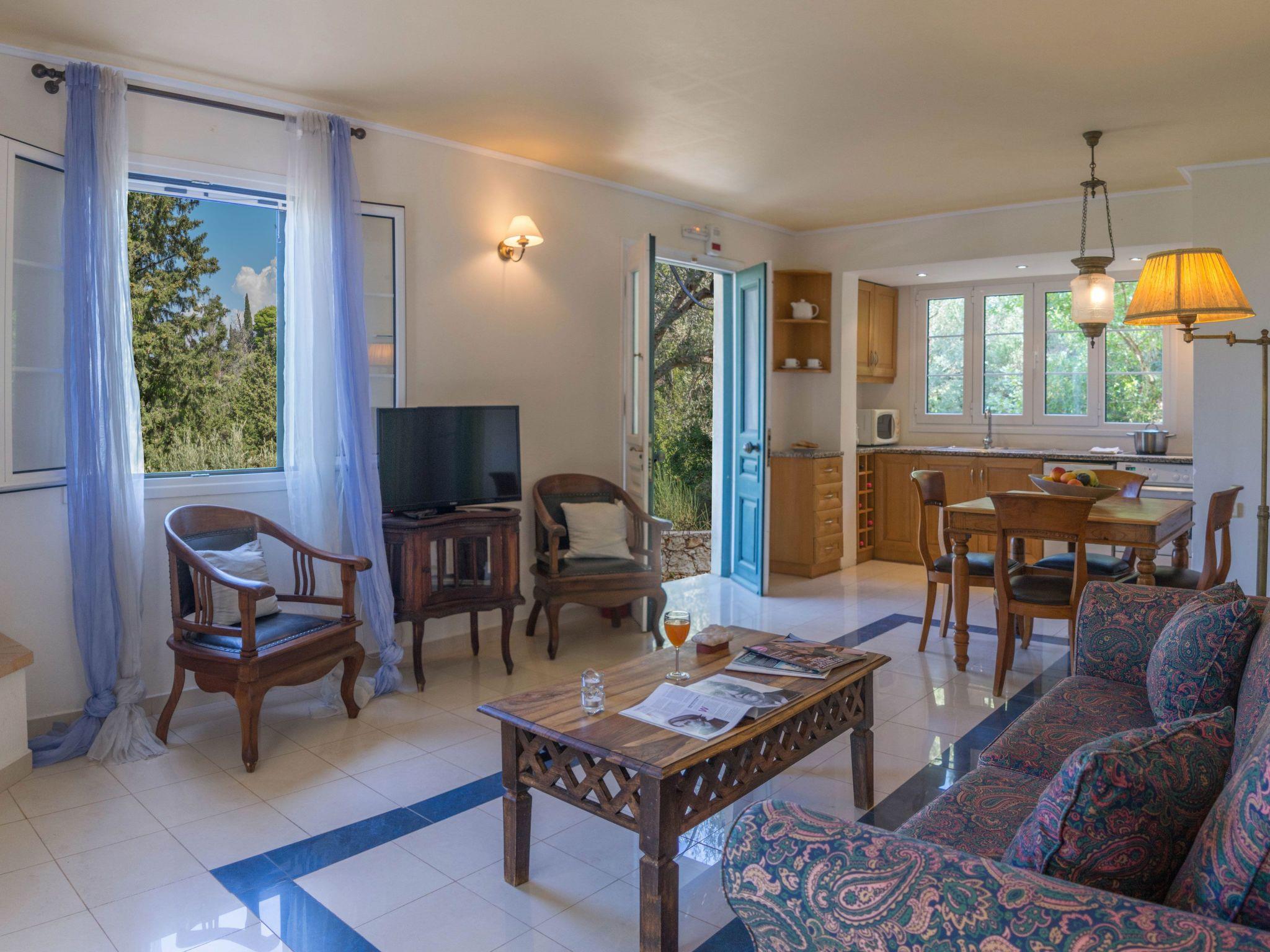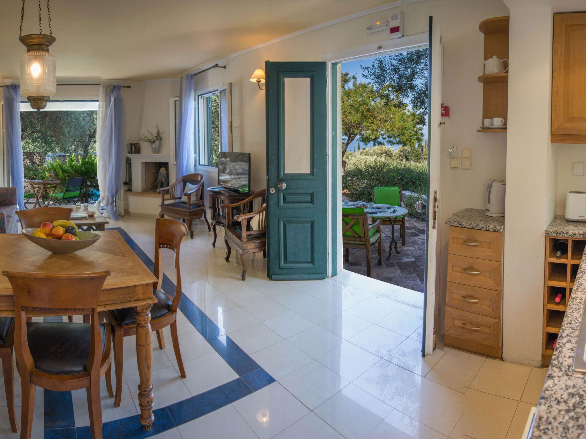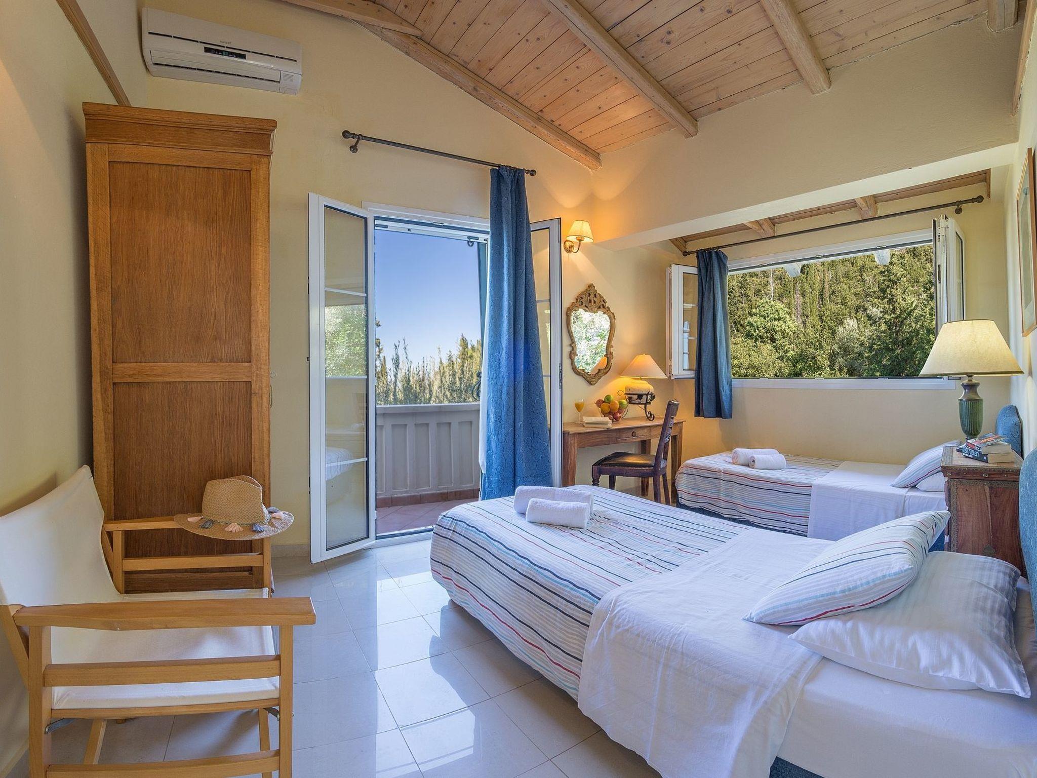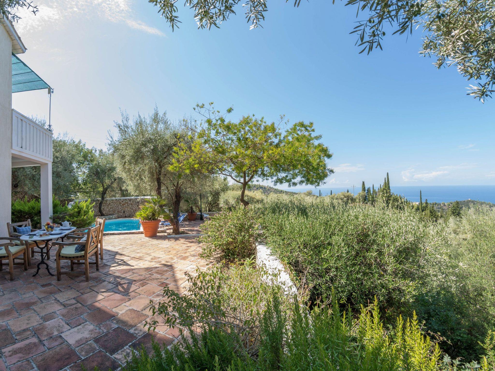 Outside: An asphalt drive leads up from the village of Agios Nikitas to the villa. It is set on private lanscaped grounds on different levels using natural stone for walls and for patios. There is a cloam oven and B.B.Q. and patio furniture. Around the private swimming pool (8,2m x 4,2m x 1,35 depth) is a secluded terracotta tiled terrace with sunbeds. The pathways, patio, pool and private parking area are lit at night. You can enjoy from villa sea and hill views.