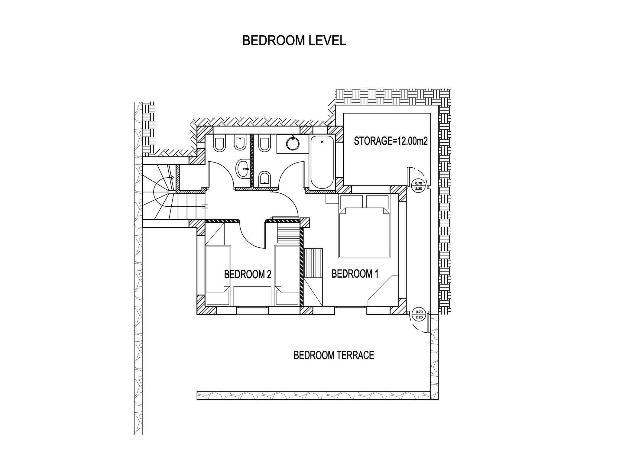 Bedroom level: A staircase eads down to one double bedroom, with en-suite spacious bathroom, leading to big open terrace and one twin bedded room, leading to the same open terrace, next to another bathroom with shower.