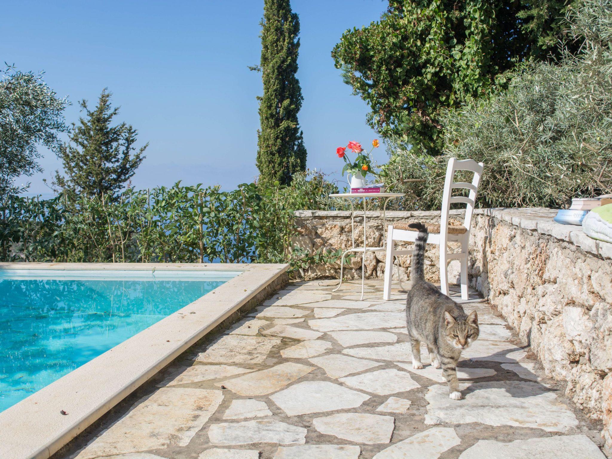 The villa is located in a quiet setting, near Agios Nikitas village. An asphalt drive leads up from the village of Agios Nikitas to the villas Spiaggia Dorata, Isola Bella, Vista Splendida, Mare Magico and Acqua Azzurra. Situated on two different levels, natural stone walls, olive and cypress trees, shrubs, thymes, sages and climbers surround each villa to create privacy.