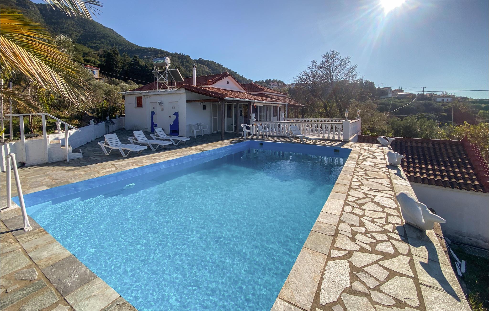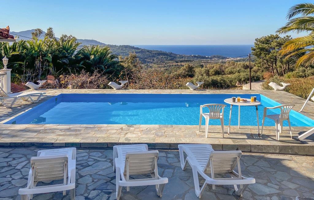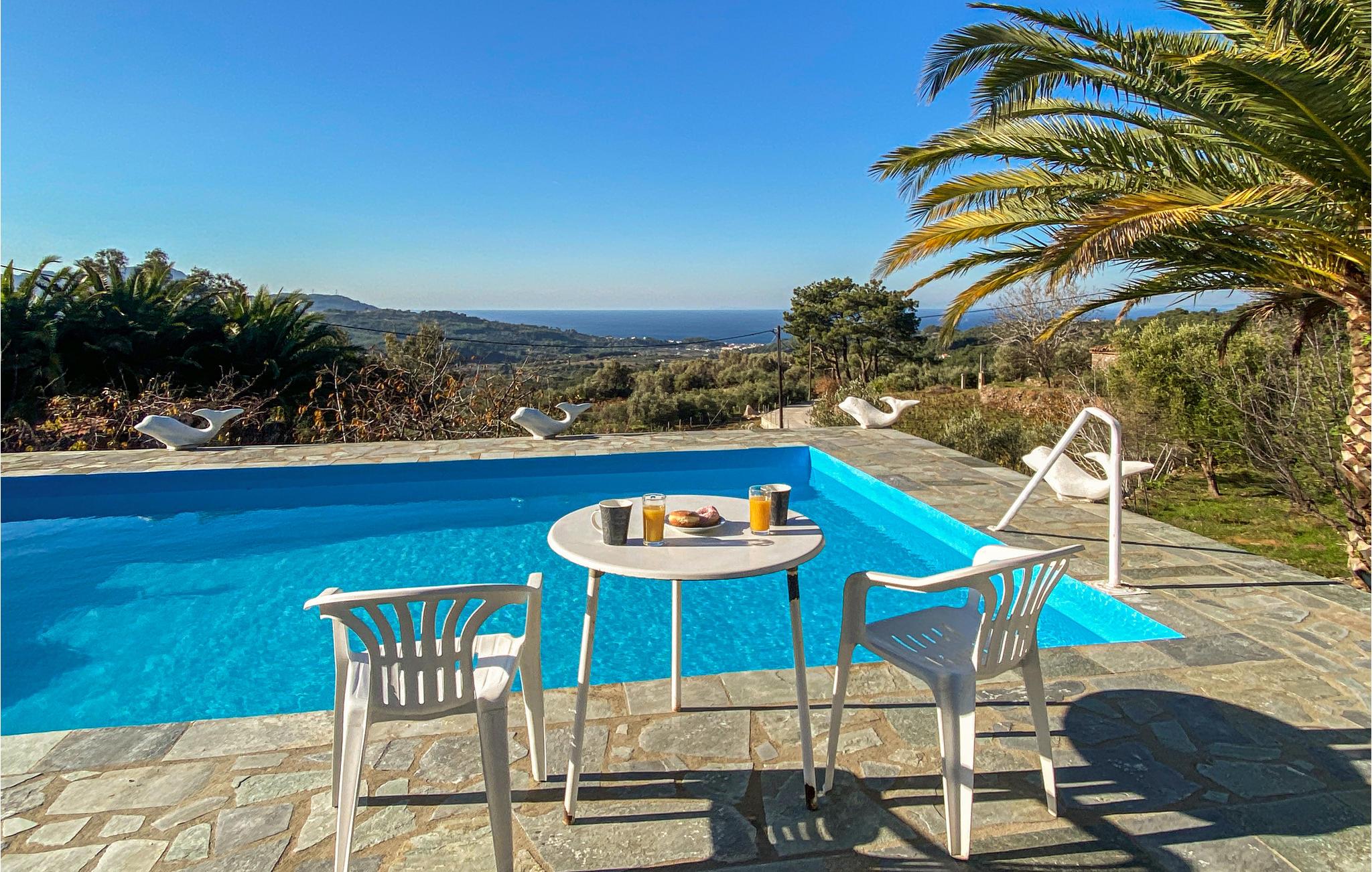 Dette rummelige hus i Idroussa på Samos, tilbyder en ideel kombination af komfort og naturoplevelser. Her kan I slappe af i private omgivelser og nyde den imponerende havudsigt. Udenfor er der en privat swimmingpool perfekt til afkøling under den græske sol, mens I indendørs kan forkæle jer selv med et spa til afslapning.