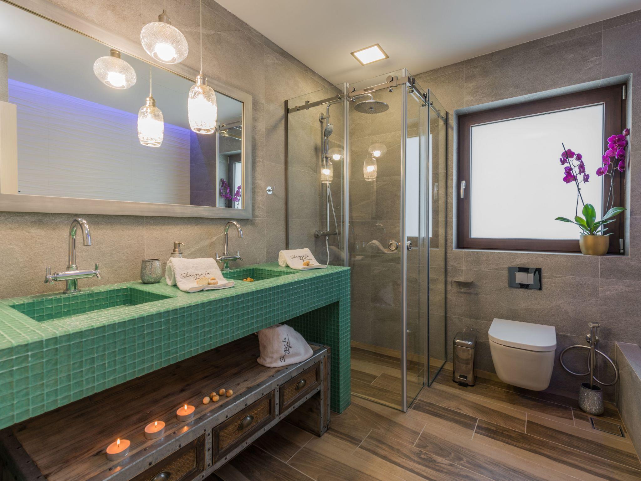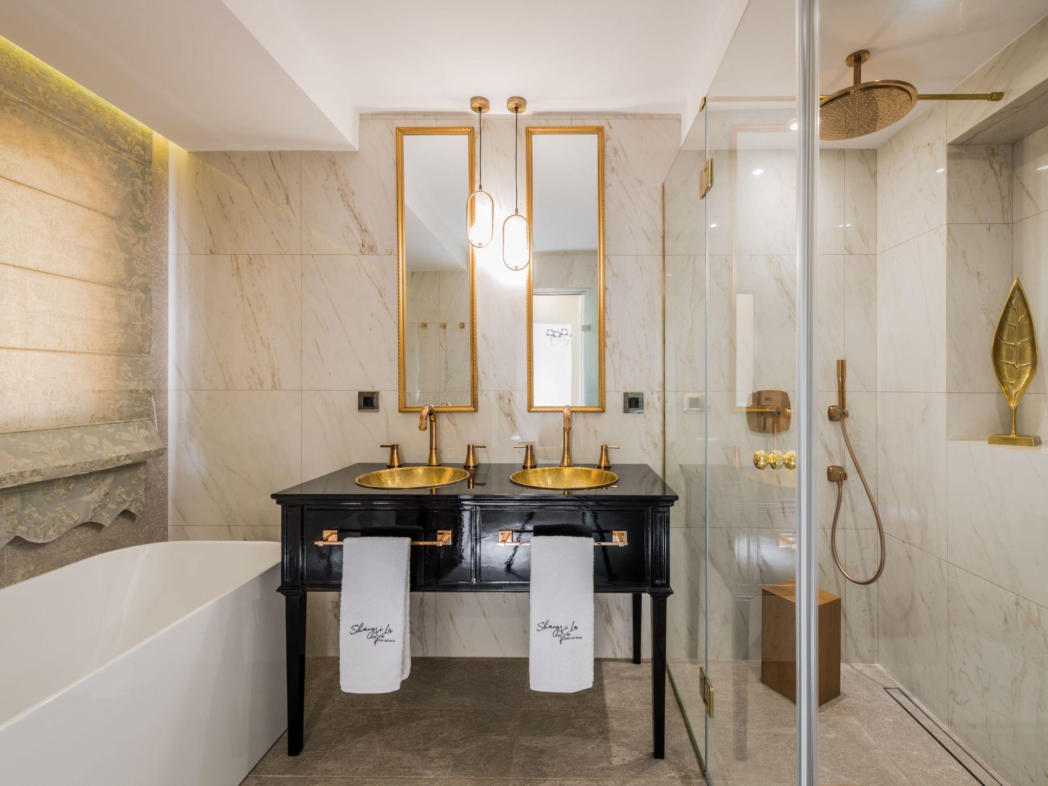The ground floor of the villa features a grand dining area, which can accommodate the curious palates of 10-12 guests. Also, on the ground floor there is a spacious kitchen, fully-equipped with 2 ovens, microwave, induction hot plates and professional kitchenware. The kitchen’s illuminant glass partition overlooks the stunning BBQ area. Adjacent there is a commodious, modern sitting area with a comfortable couch and a 75-inch Samsung smart, satellite TV, ideal for relaxing moments. The absolutely luxurious master bedroom features a king-size bed (2 metres width), with His & Hers walk-in closets. The extra refined master bathroom promises exquisite moments of solitude with a free-standing bathtub and a seperate shower. All faucets are exquisite and tailor made in brass-rose-gold colour. On the same floor, there are two standard suite bedrooms, also featuring king-size beds or four single ones depending on our guests’ needs, an elegant WC, a classy ensuite tropical bathroom and a laundry area. Each bedroom has their own private bathroom, perfect for a much needed tranquil break. On the first floor