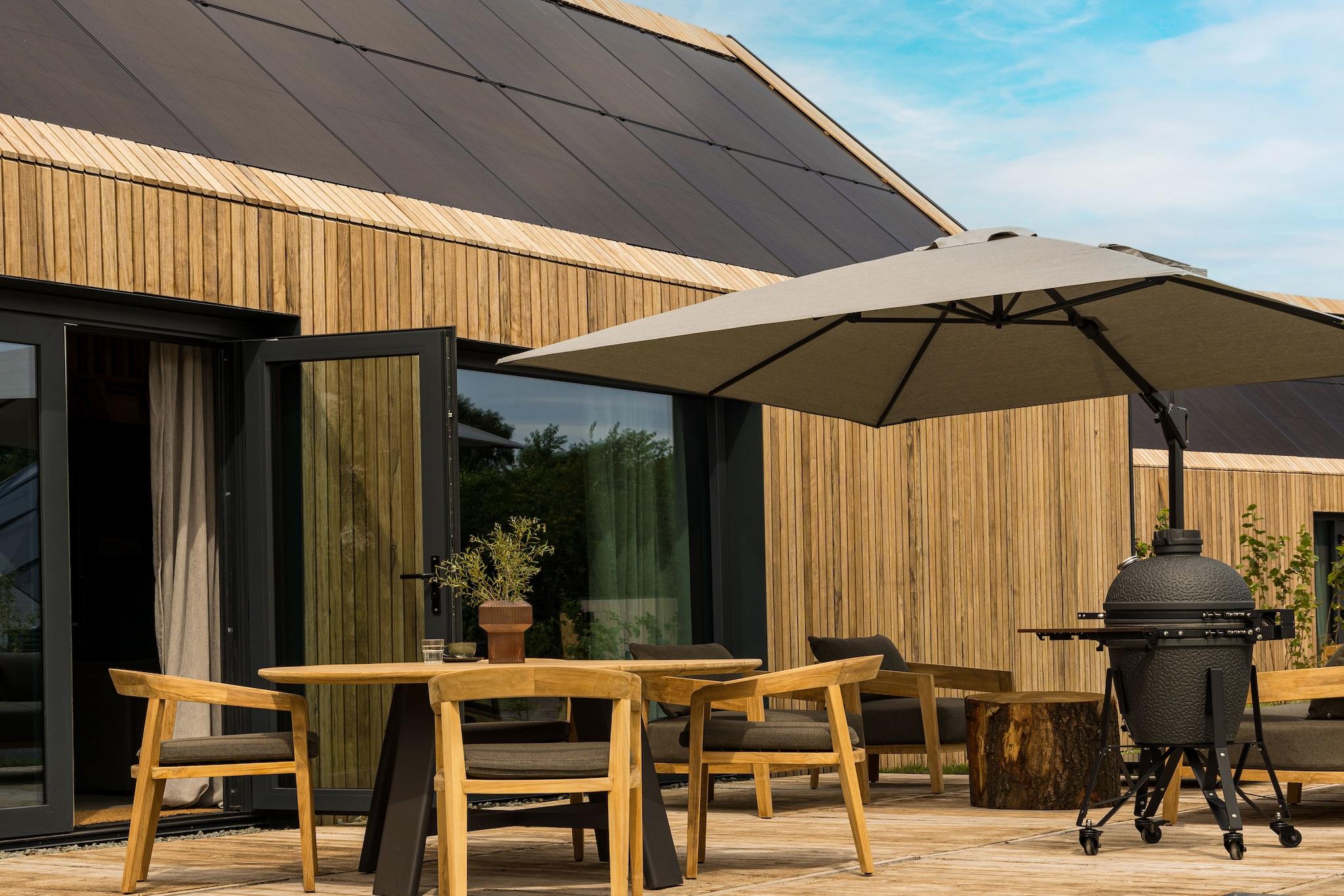 Stueetage: (entre, Stue(Fjernsyn), åbent køkken(cooker, komfur(induktion), kaffemaskine(kopper), combi-mikroovn, opvaskemaskine , køle-fryseskab), Soveværelse med badeværelse(dobbeltseng, bruser, håndvask, toilet, føntørrer), Soveværelse med badeværelse(dobbeltseng, bruser, håndvask, toilet, føntørrer)) trådløst musiksystem, tørretumbler, sauna, vaskemaskine, varme(gennem aircondition), klimaanlæg, terrasse, have, havemøbler, grill, swimmingpool(deles med andre gæster), loungemøbler, Ladestation til el-biler