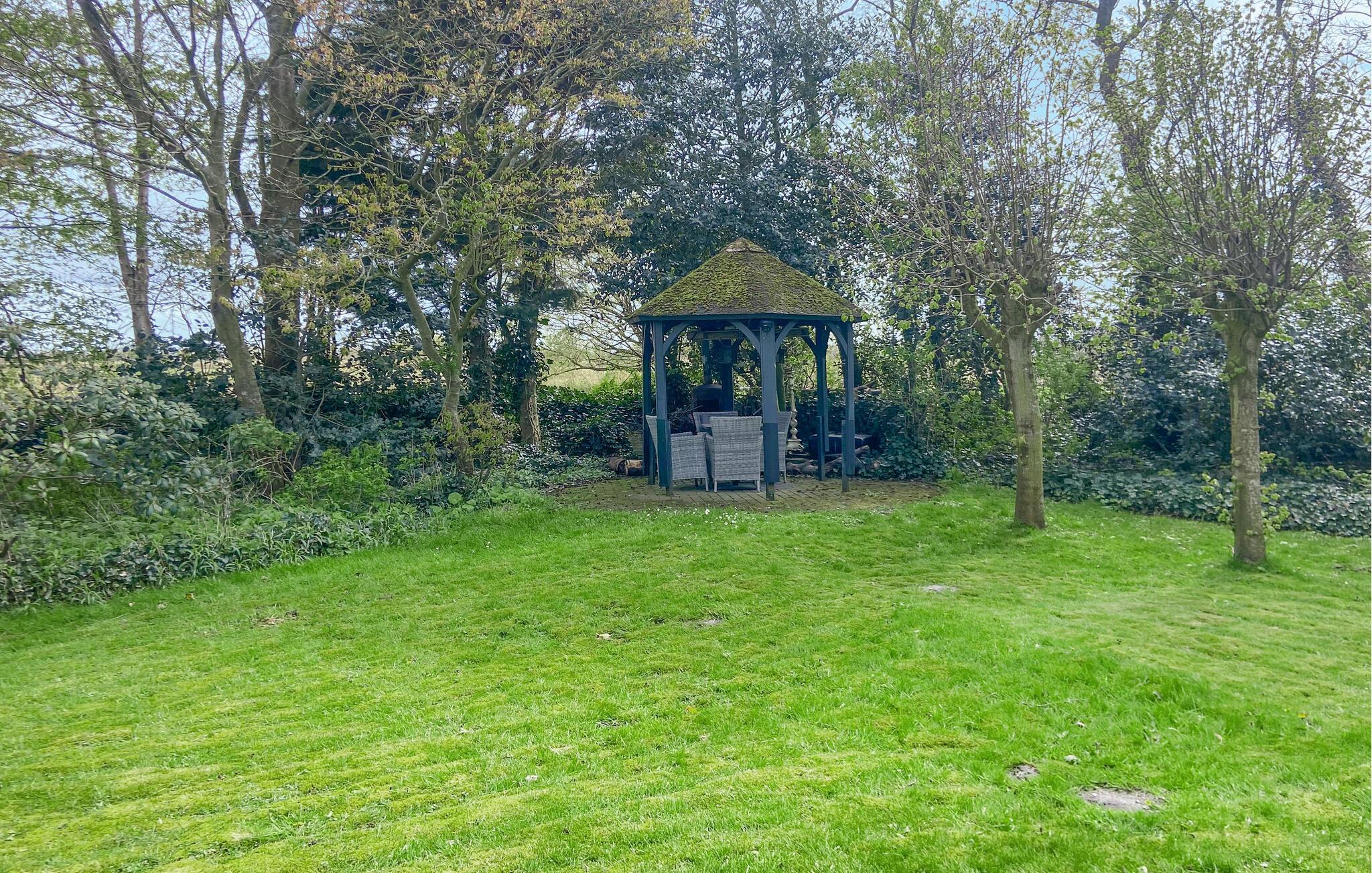 Udeområdet er tilsvarende lækkert. Her kan I mødes på den rummelige terrasse og begynde dagen med en lækker morgenmad med udsigt over den velplejede have. Hvis I foretrækker skyggen, kan I sætte jer godt til rette med en bog under den lille pavillon i haven, mens børnene kan lege på den brede græsplæne.
