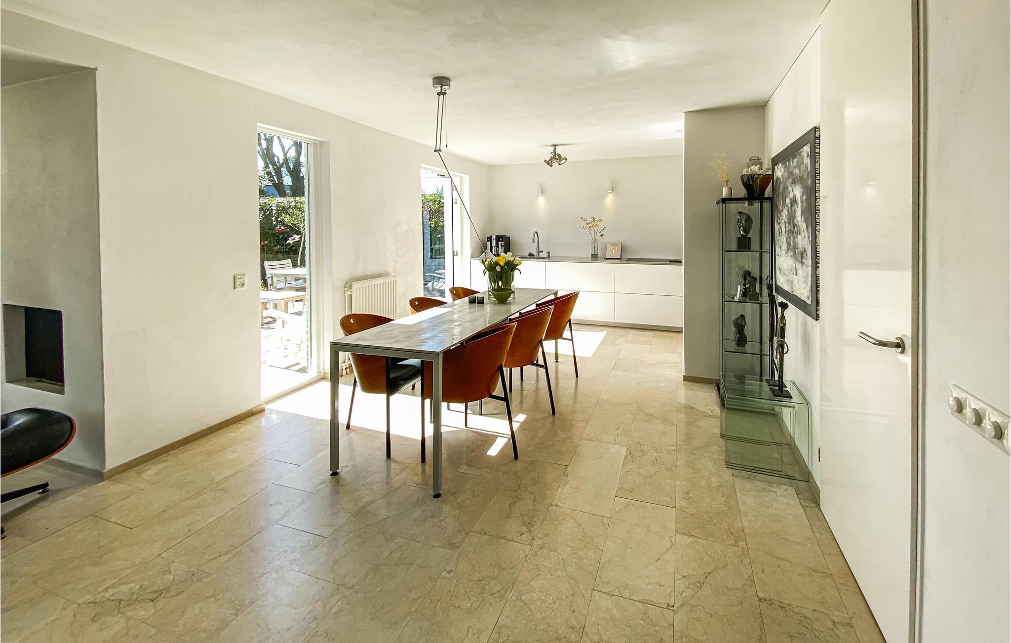 Pejsestuen har et dejligt lysindfald fra de store vinduespartier mod haven. I køkkenet er der en hyggelig spiseplads, hvor I kan samles om dagens måltider.