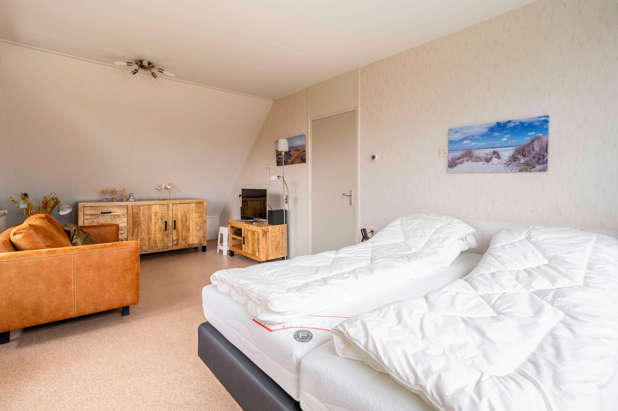 Et moderne og charmerende feriehus til 6 personer med en fuldt lukket have, beliggende nær badebyen De Koog, stranden og skoven. Dette feriehus er smagfuldt møbleret og fuldt udstyret. Entréen fører ind i stuen med en dejlig siddegruppe og smart-tv. Udenhaveområdet har en spiseplads med spisebord til 6 personer. De mange vinduer gør det til et dejligt lyst rum med udsigt over haven og terrassen. Det åbne køkken er fuldt udstyret med forskellige indbyggede apparater, herunder en kombinationsovn, opvaskemaskine og diverse kaffemaskiner. Der er tre soveværelser. Det ene ligger i stueetagen og har en komfortabel dobbelt boxmadras og et tv. Dette soveværelse har også et ensuite badeværelse med en rummelig bruseniche, håndvask og toilet. Ovenpå er der to soveværelser, begge med to enkeltsenge med boxmadras. Det ene soveværelse har et tv og en privat terrasse. Der er også et badeværelse på første sal med bruser, håndvask og toilet. Et separat toilet er placeret i stueetagen. Fra vinterhaven åbner skydedøre ud til haven og den sydøstvendte terrasse, hvilket giver den perfekte mulighed for at nyde naturen. Terrassen er møbleret med havemøbler, og haven er fuldt indhegnet. Vaskemaskine og tørretumbler er placeret i bryggerset. Et ekstra køleskab med fryser er også tilgængeligt i bryggerset. Gratis Wi-Fi er tilgængelig. Børnemøbler kan lejes mod et gebyr. Dette er en ikke-ryger ejendom. Ét kæledyr er tilladt mod et tillægsgebyr. Privat parkering til én bil i haven (porten åbnes med en fjernbetjening). Andre biler kan parkeres på gaden. Der er flere dørtrin i huset, herunder i stueetagen.