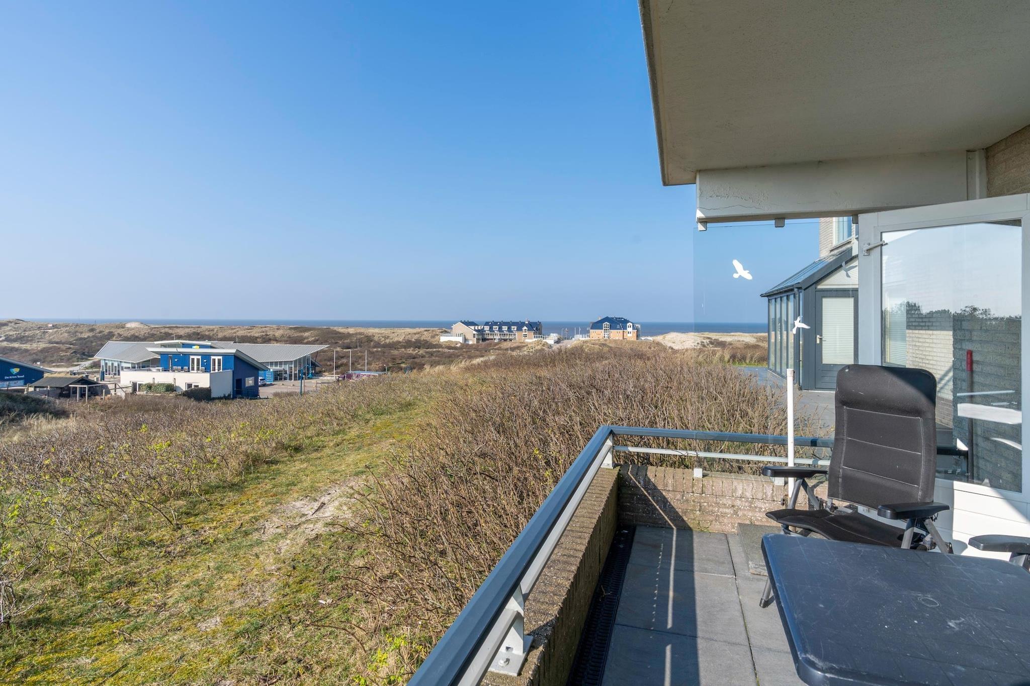 Moderne møbleret 4-personers lejlighed med en rummelig stue og terrasse med udsigt over klitterne, badebyen De Koog og Vesterhavet. Den lyse stue har et siddeområde, tv og en spiseplads med spisebord til 4 personer. Det åbne køkken er udstyret med alle moderne apparater, herunder opvaskemaskine, induktionskogeplade, kombineret mikrobølgeovn, køleskab med fryser og forskellige kaffemaskiner. Lejligheden har to soveværelser. Soveværelset er møbleret med en dobbelt boxmadras, og det mindre soveværelse med to enkeltsenge. Det mindre soveværelse ligger i midten af lejligheden og har derfor ikke et vindue med udsigt udad. Det velholdte badeværelse har en bruseniche med regnbruser og en håndvask. Et separat toilet er placeret på gangen. Den sydvendte terrasse tilbyder udsigt over klitterne, badebyen De Koog og Vesterhavet. Havemøbler er til rådighed. Et vaskerum er tilgængeligt i komplekset mod et gebyr. Børnemøbler er tilgængelige efter anmodning og mod et gebyr. Gratis Wi-Fi er tilgængelig. Rygning er ikke tilladt. Der er én parkeringsplads tilgængelig på stedet per indkvartering.