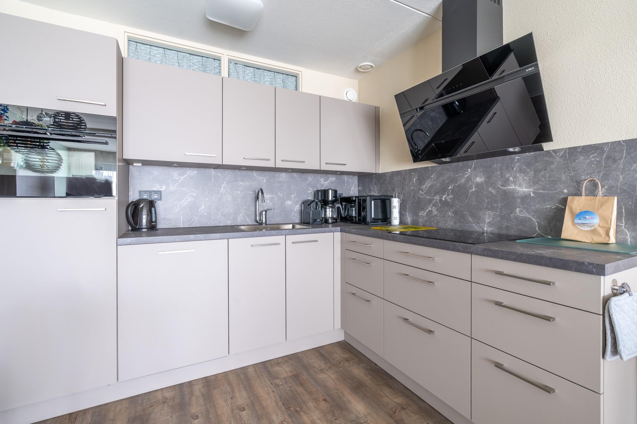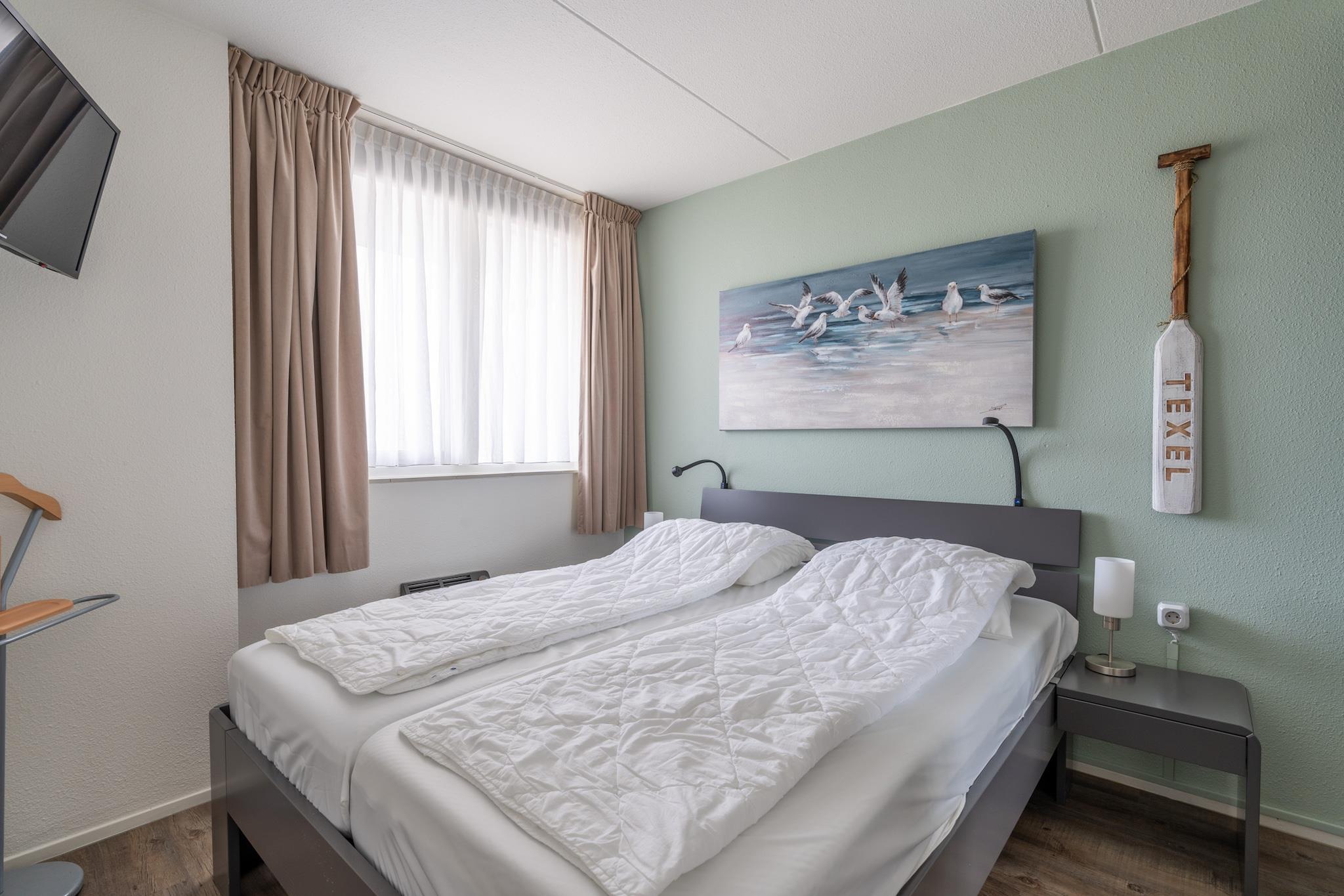 Denne charmerende og komfortable lejlighed til 4 personer med åbent køkken blev renoveret i vinteren 2024 og ligger på første sal med udsigt over De Koog, klitterne og Nordsøen. Den lyse stue har et siddeområde, tv og en spiseplads med spisebord til 4 personer. Køkkenet blev fuldstændig renoveret og udvidet i vinteren 2024. Det åbne køkken er fuldt udstyret med opvaskemaskine, kombineret mikrobølgeovn, køleskab med fryser og forskellige kaffemaskiner. Lejligheden har to soveværelser. Soveværelset har en dobbeltseng med to enkeltmadrasser fra Auping og et tv. Det mindre soveværelse har to enkeltsenge med boxmadras og er placeret midt i lejligheden, hvilket betyder, at det ikke har et vindue med udsigt udad. Badeværelset har bruseniche med regnbruser og håndvask. Der er et separat toilet på gangen. Den sydvendte balkon tilbyder en fantastisk udsigt over Nordsøen, klitterne og badebyen De Koog. Havemøbler er til rådighed. Der er et vaskerum på stedet mod et gebyr. Børnemøbler er tilgængelige efter anmodning og mod et gebyr. Gratis Wi-Fi. Rygning er ikke tilladt. Der er én parkeringsplads på stedet pr. indkvartering.