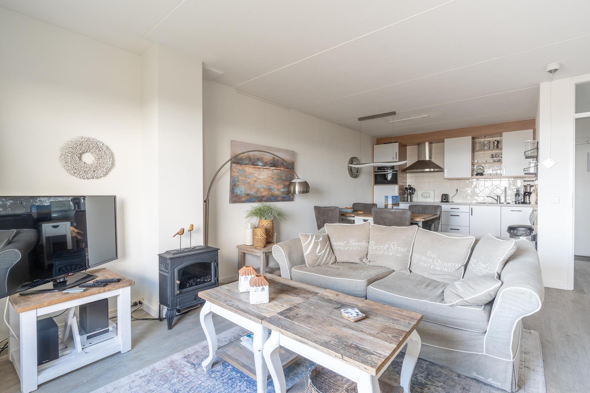 Komfortabel lejlighed til to personer på første sal med en smuk udsigt over Vesterhavet og klitterne. Et dejligt badeværelse med solbruser. Den lyse stue har et opholdsområde med tv og en dekorativ pejs, der skaber en hyggelig atmosfære, når man tænder den. Der er også en spiseplads med et spisebord til fire personer. Det pæne åbne køkken er fuldt udstyret med opvaskemaskine, kombineret mikrobølgeovn, køleskab med fryser og flere kaffemaskiner. Soveværelset har to enkeltsenge med boxmadras og et tv. Fra soveværelset er der også udsigt over Vesterhavet. Det pæne badeværelse har en bruseniche med regnbruser og solbruser samt en dobbelt håndvask. Toilettet er placeret separat. Den vestvendte balkon tilbyder en smuk udsigt over Vesterhavet. Havemøbler er til rådighed. Et vaskerum er tilgængeligt i komplekset mod et gebyr. Børnemøbler er tilgængelige efter anmodning og mod et gebyr. Gratis Wi-Fi. Rygning er ikke tilladt. Der er 1 parkeringsplads til rådighed pr. bolig på stedet.