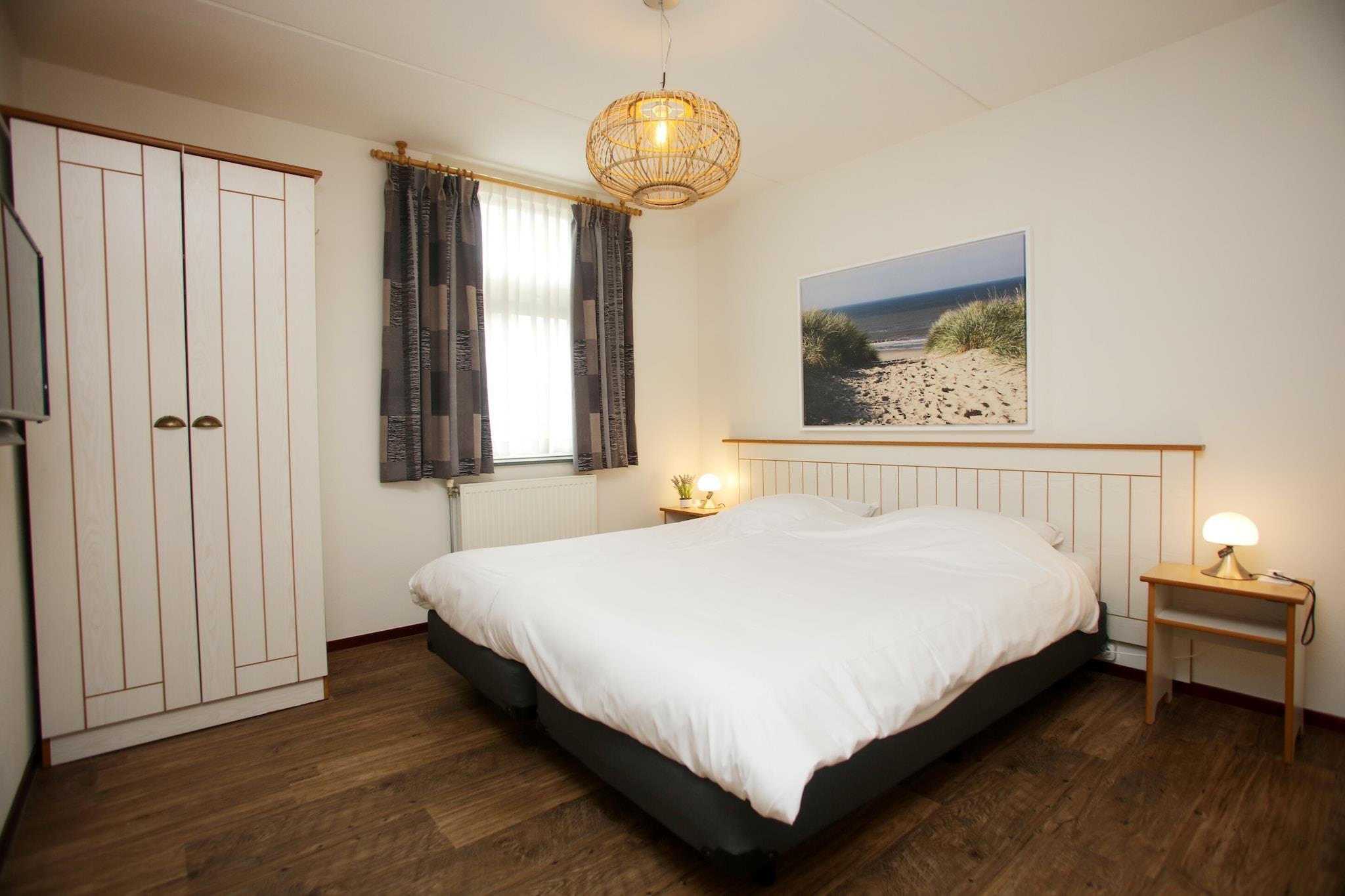 Dette nyrenoverede, fritliggende feriehus ligger i Kustpark Texel på øen med samme navn. Der er masser af plads her: det samlede areal er 115 m2. I stueetagen finder du en stue med smart-tv og en behagelig dekorativ pejs, åbent køkken med apparater, herunder opvaskemaskine og mikrobølgeovn. Du finder også et soveværelse med to enkeltsenge samt et badeværelse med bruser og badekar. På første sal finder du yderligere to soveværelser, begge møbleret med to enkeltsenge, samt et badeværelse med bruser. Alle sengene er 1-personers boxmadras, enten skubbet sammen til en dobbeltseng eller brugt separat i en dobbeltværelsesopsætning. Udenfor er der en rummelig have med terrasse og havemøbler. Der er også et opbevaringsrum og parkeringsplads til én bil. Både feriehusenes interiør og eksteriør kan variere. Billederne og beskrivelserne er vejledende.