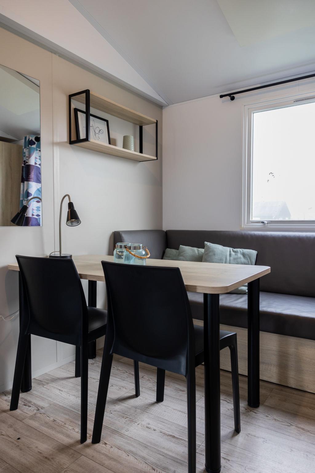 "4-persoons Hilda", 3-room mobile home 27 m2. Comfortable furnishings: living/dining room with dining table and flat screen. Exit to the terrace. 1 room with 2 beds. 1 room with 1 double bed (1 x 160 cm, length 190 cm). Open kitchen (4 hot plates, dishwasher, kettle, microwave, electric coffee machine). Shower, sep. WC. Electric heating. Terrace. Terrace furniture. Facilities: Internet (WiFi, free). Please note: non-smokers only. Maximum 1 pet/ dog allowed. Smoke alarm.