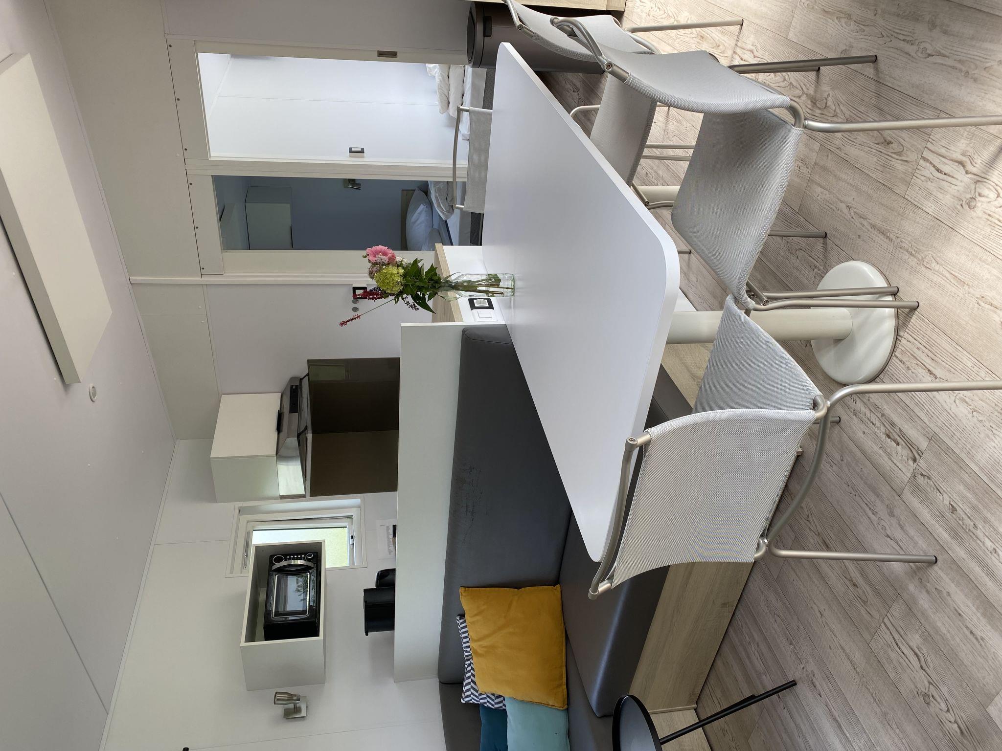 "6-persoons Eke", 4-room mobile home 40 m2. Comfortable furnishings: living/dining room with dining table and flat screen. Exit to the terrace. 2 rooms, each room with 2 beds. 1 room with 1 double bed. Open kitchen (4 hot plates, dishwasher, kettle, microwave, electric coffee machine). Shower/WC. Electric heating. Terrace. Terrace furniture. Facilities: Internet (WiFi, free). Please note: non-smokers only. Maximum 1 pet/ dog allowed. Smoke alarm.