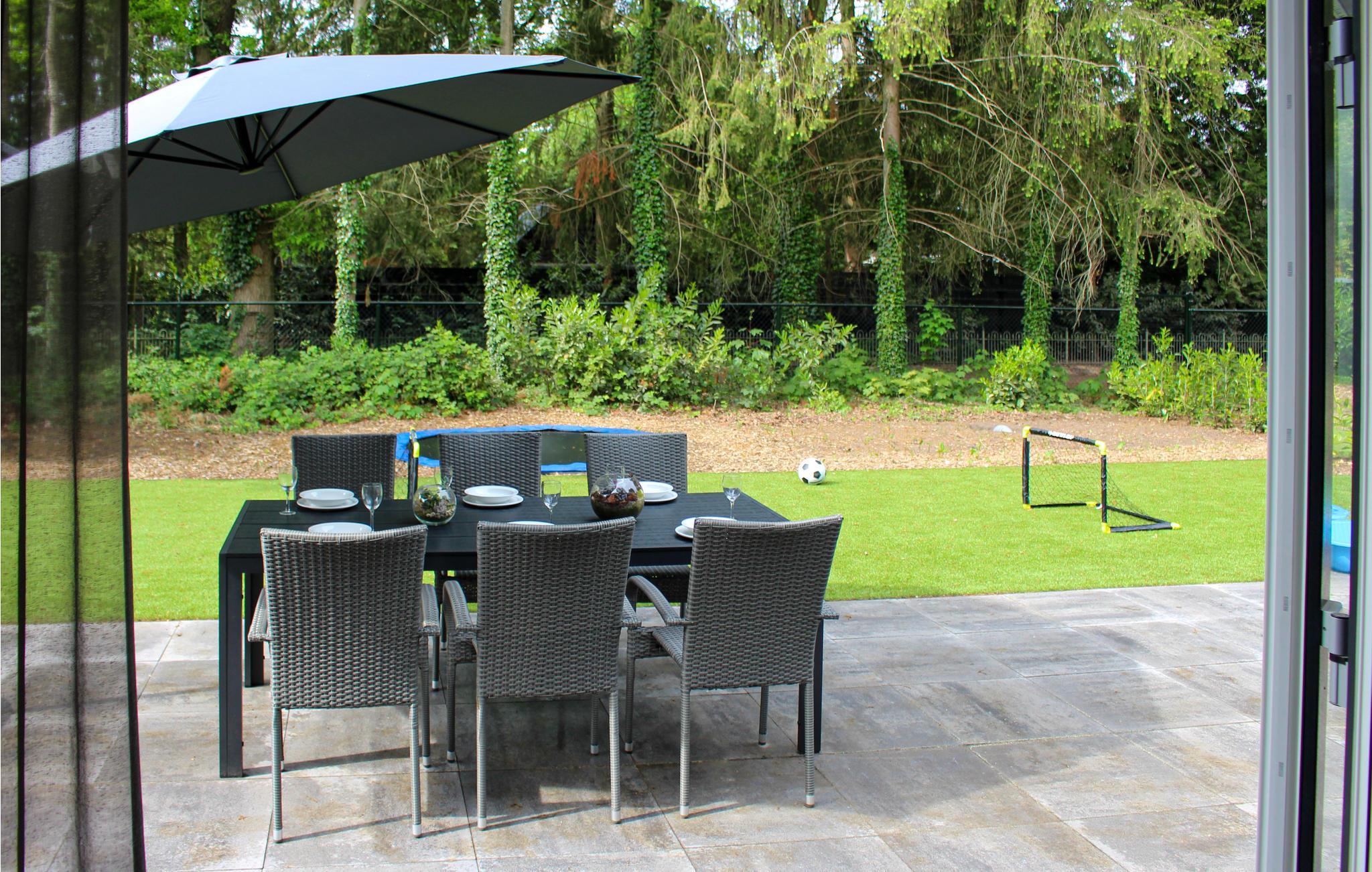 Stuen fører ud i haven og den åbne terrasse, som er perfekt til at læse eller spise sammen. Børnene vil elske trampolinen i haven.