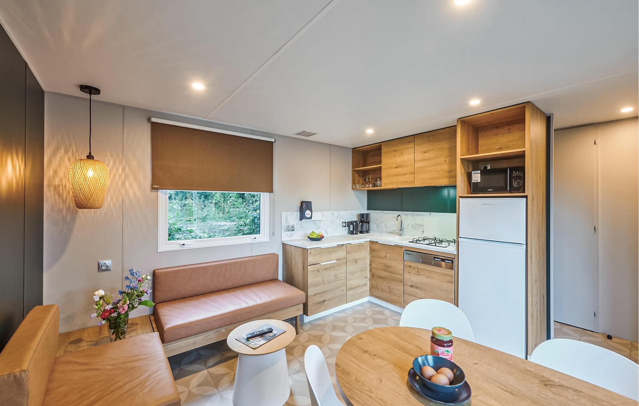 Forkæl jer selv med et glas vin på varme sommeraftener eller en varm te på jeres private træterrasse i de køligere måneder. Lad børnene få nye venner ved den fælles pool og udforsk haverne, mens de leger.