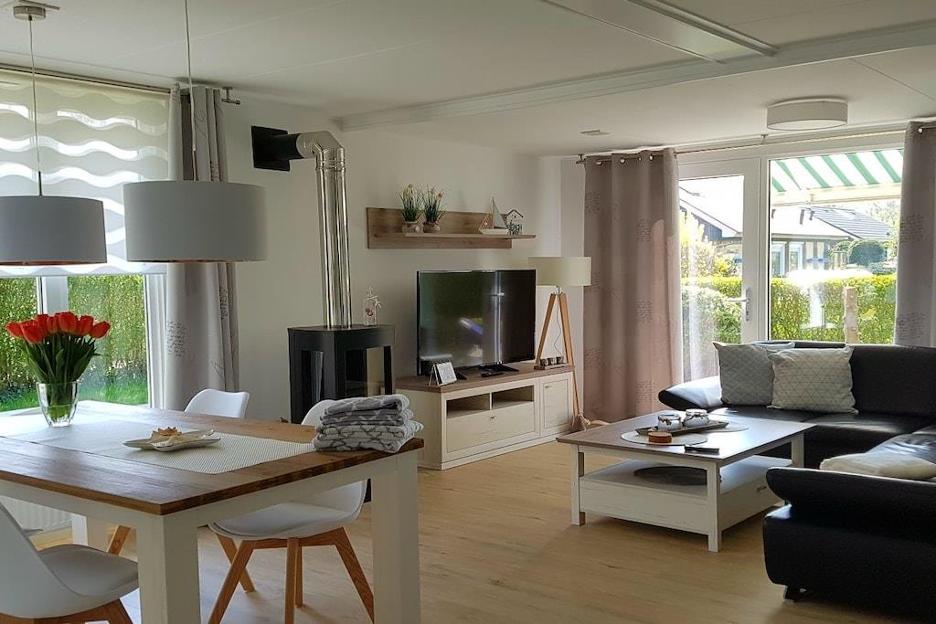 Herzlich Willkommen in der Villa Strandzeit! Besuchen Sie unsere Luxusvilla Strandzeiten für Ihren Urlaub am Meer. Das freistehende Ferienhaus wurde von Grund auf saniert und modern und komfortabel ausgestattet. Die ebenerdige Unterkunft bietet auf 75 m² Platz für 4 Gäste. Der sichtgeschützte Garten ist komplett umzäunt. Die windgeschützte, möblierte Terrasse verfügt über eine Markise. Das Haus wurde komplett neu und hochwertig möbliert. Highlights: Sonnenheller Wohn-Essbereich mit großer Ledercouch und Gaskaminofen, WLAN, Infrarotsauna, top ausgestattete Nobilia Küche, 2 Schlafzimmer mit großen Schränken und Sat-TV, Badezimmer mit bodengleicher Dusche, Gäste-WC mit Waschbecken und Waschmaschine.