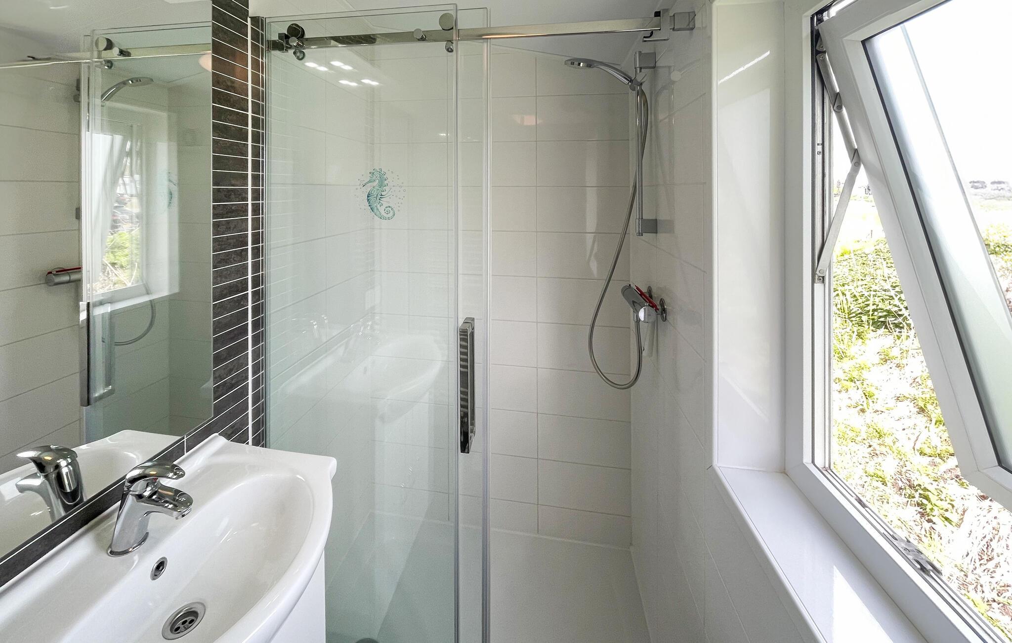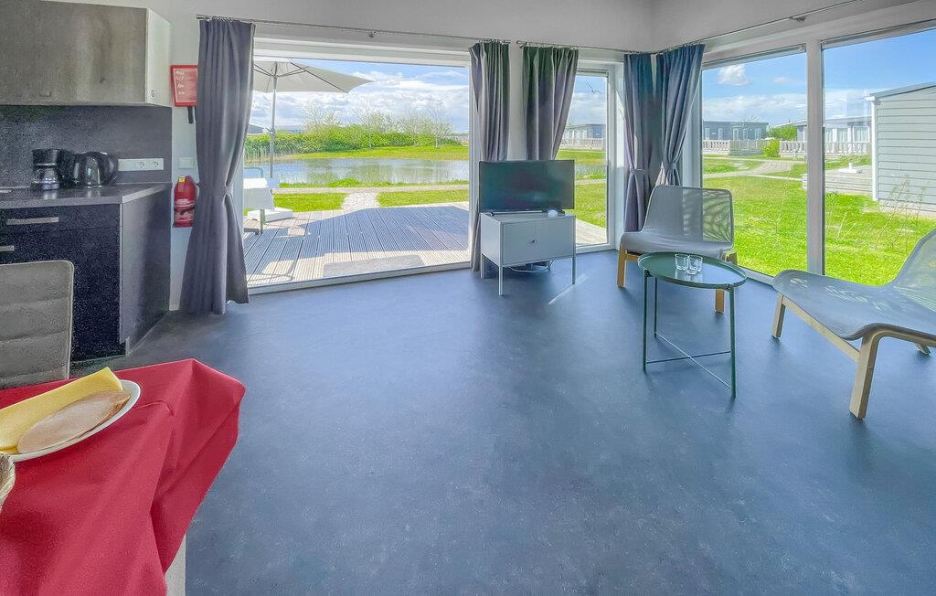 Dette hyggelige og moderne feriehus er det ideelle sted at tilbringe en fredelig og afslappende ferie ved vandet. Den moderne og stilfulde minimalisme, kombineret med gulv-til-loft-vinduerne i stuen, skaber en indbydende og behagelig atmosfære, hvor I ikke vil mangle noget. Nyd jeres måltider, fra morgen til aften, på den dejlige træterrasse og nyd udsigten over vandet.