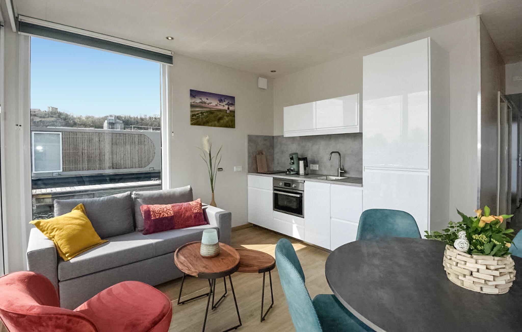 Denne husbåd ligger fortøjet på en dejlig lystbådehavn med masser af faciliteter og en fantastisk restaurant i gåafstand. Som familie kan I se frem til en afslappende tid i denne husbåd, som har moderne møbler og udstyr. Nyd komforten i den lyse stue, hvor I kan lave mad sammen eller bare slappe af i sofaen. Begynd jeres dag med en dejlig morgenmad på den overdækkede terrasse eller nyd eftermiddagssolen på tagterrassen med en kølig drink.