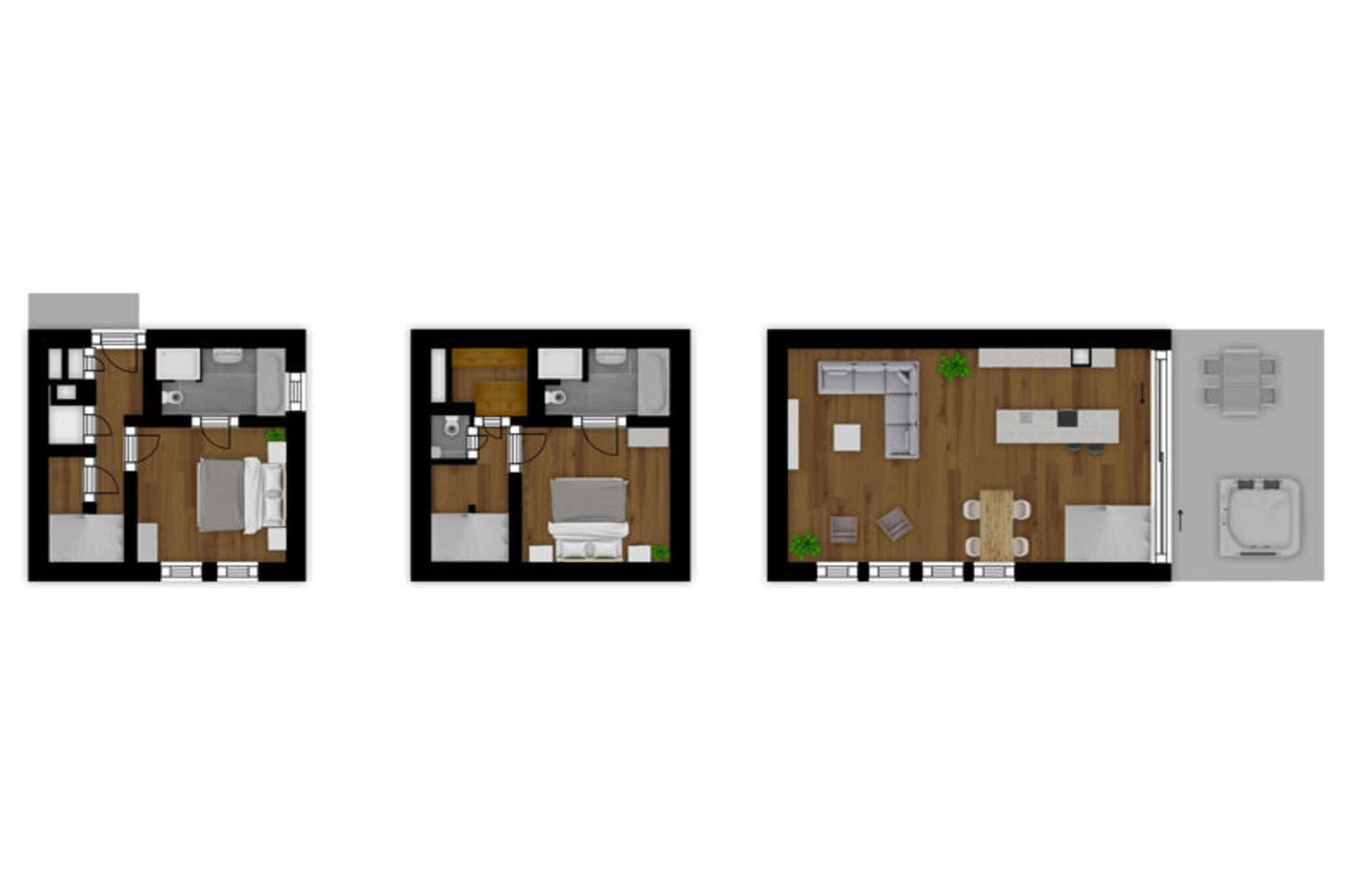 Stueetage: (entre(toilet), soveværelse(dobbeltseng eller 2 enkeltsenge Senge, Fjernsyn, sofahjørne), badeværelse(bruser, håndvask, toilet)) På 1. etage: (soveværelse(dobbeltseng eller 2 enkeltsenge Senge), badeværelse(bruser, sauna, håndvask)) På 2. etage: (Stue(sofahjørne, varme), åbent køkken(spisebord, elkedel, komfur(Komfur med fire kogeplader, induktion), emhætte, kaffemaskine(kopper), combi-mikroovn, opvaskemaskine , køleskab), Bubble bath, tagterrasse, loungemøbler) parking lot(public), swimmingpool(deles med andre gæster, indendørs)