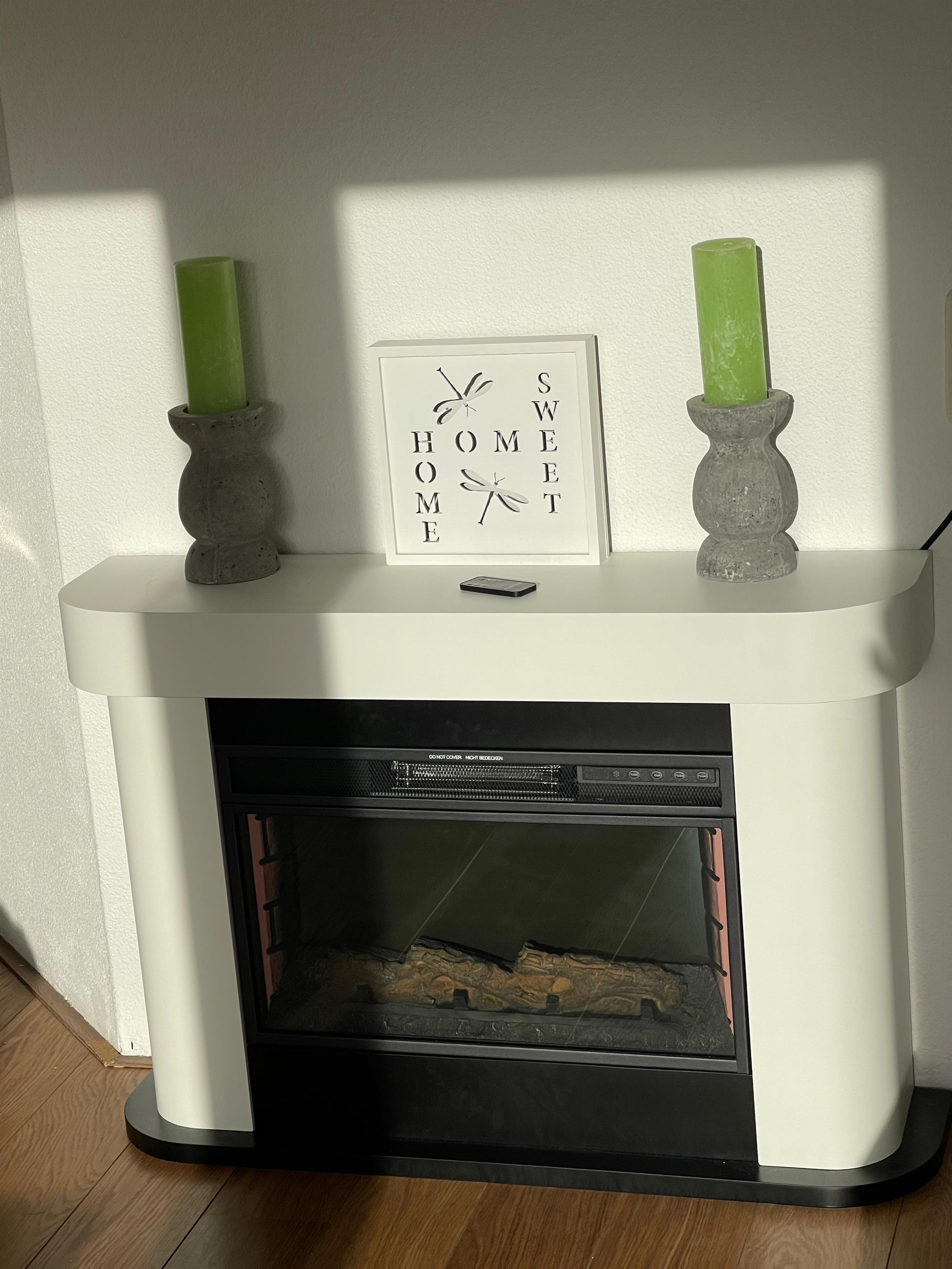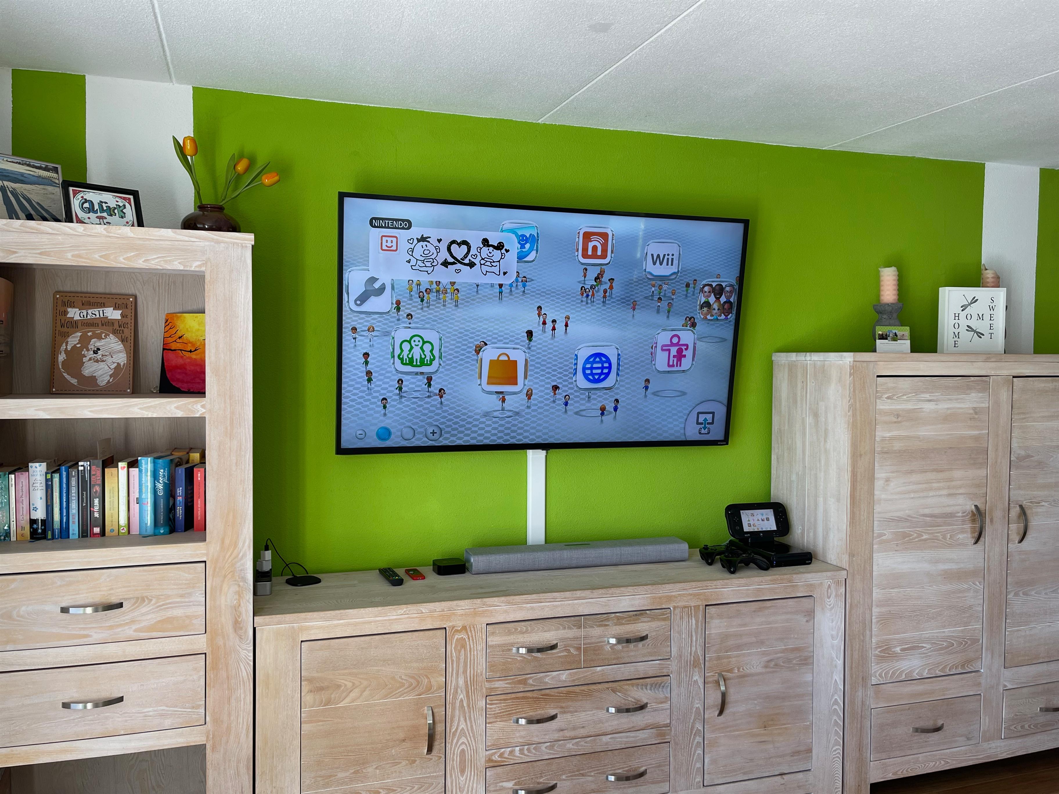 2022: WiiU Spielekonsole und Elektrokamin im Wohnzimmer und 32 Zoll Smart TV im Schlafzimmer