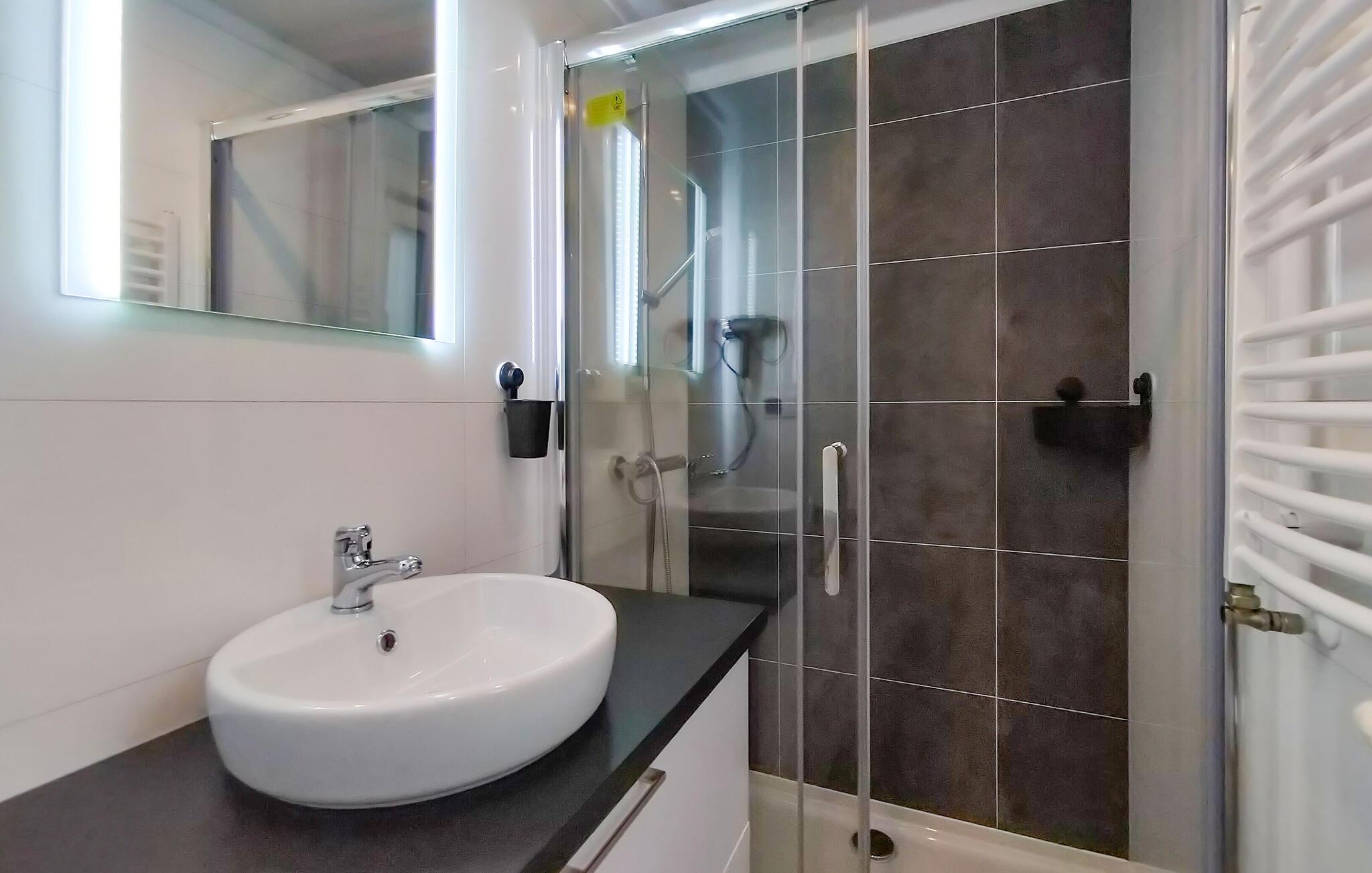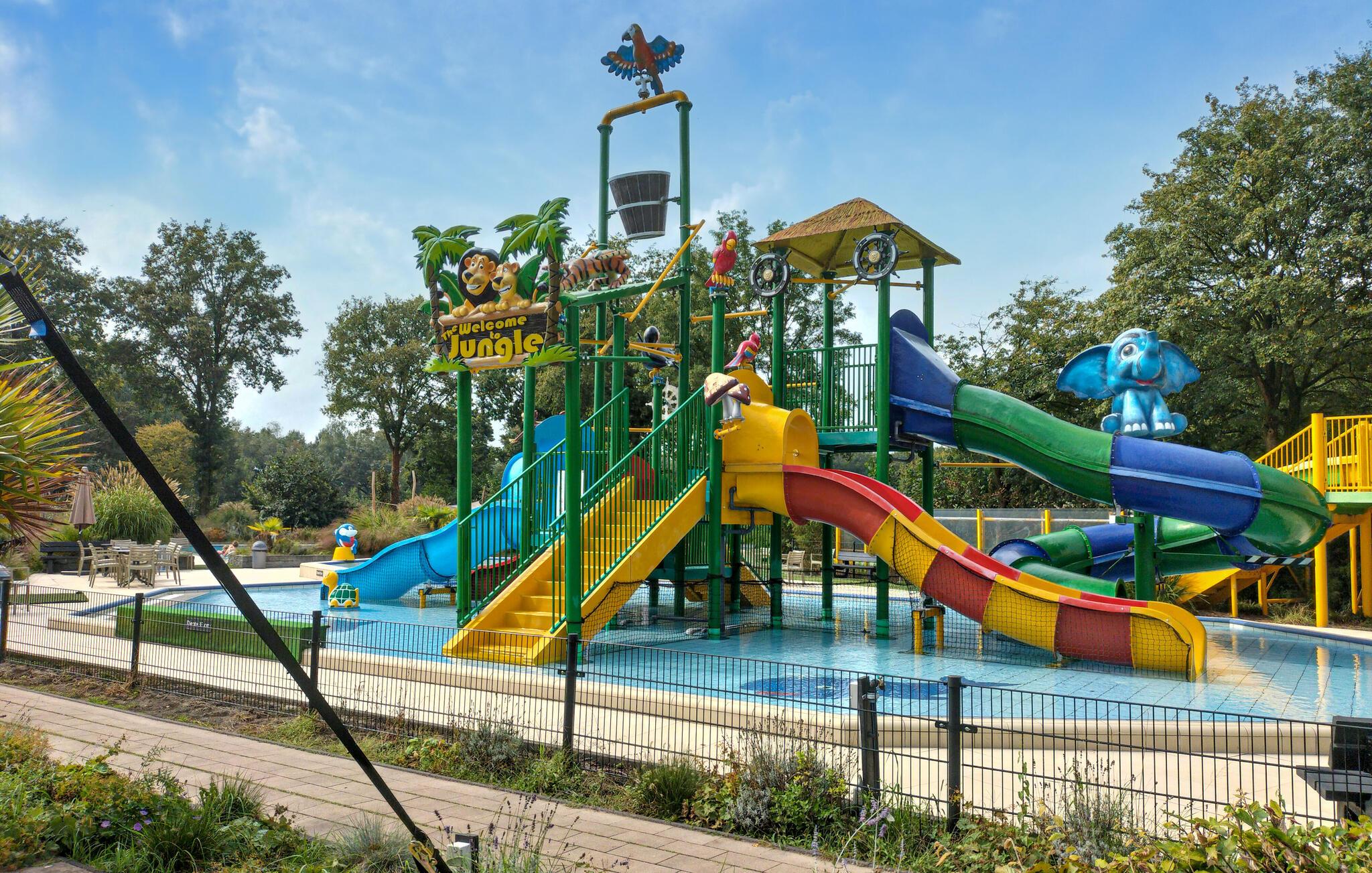 Centralt placeret på campingpladsen er alle faciliteter let tilgængelige herfra. Friluftsbassinet og badesøen med strand ligger kun få skridt væk. Legeplads, klappezoo og spisesteder er også i umiddelbar nærhed. Chaletet er tilgængeligt med bil, som også kan parkeres ved boligen.