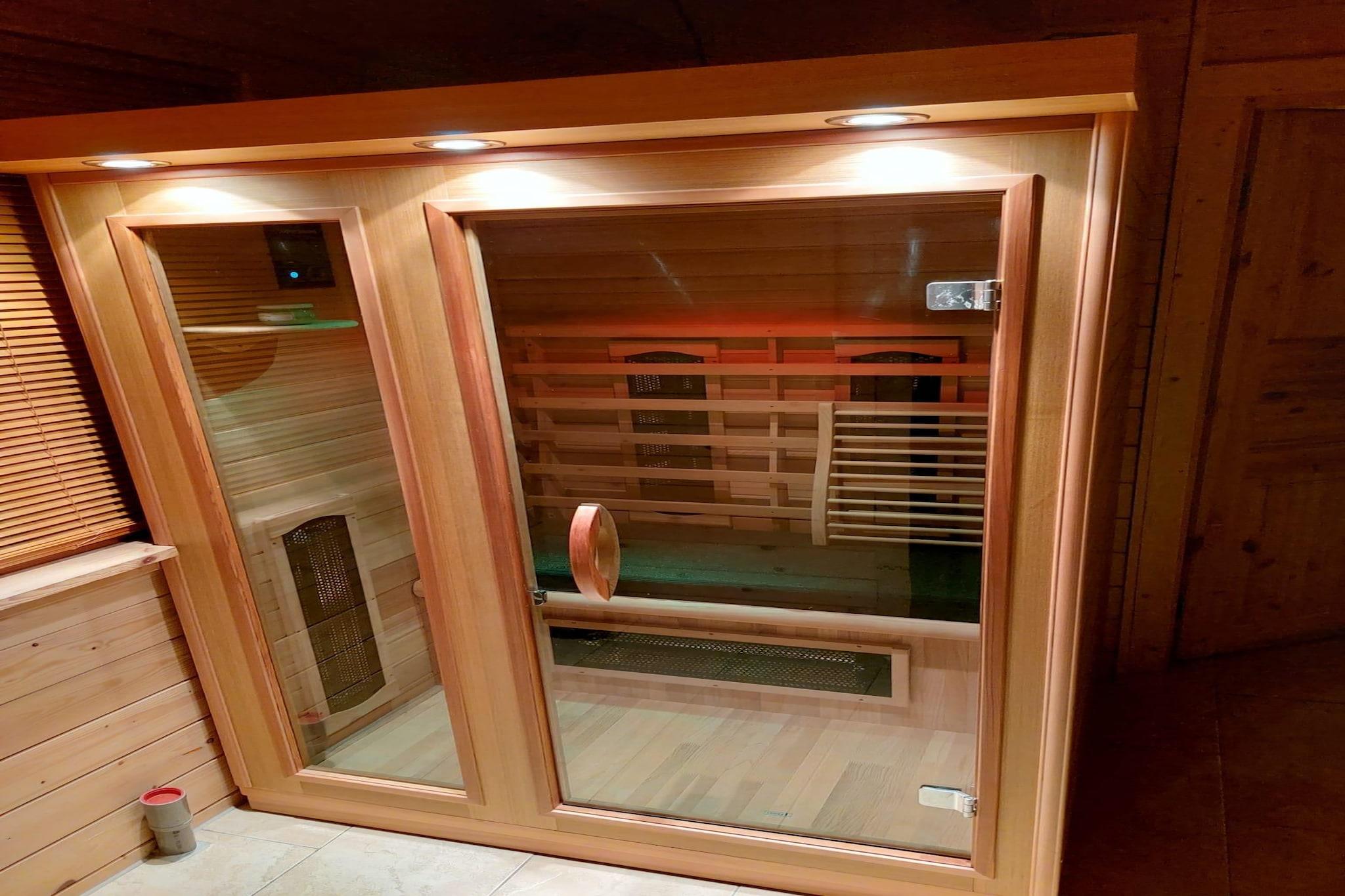 Stueetage: (Stue(Fjernsyn, Netflix, radio, CD-afspiller, balkon eller terrasse), åbent køkken(elkedel, kaffemaskine, combi-mikroovn, køleskab, fryser), soveværelse(dobbeltseng), badeværelse(bruser, infrarød sauna, håndvask, toilet)) På 1. etage: (soveværelse(dobbeltseng), soveværelse(enkeltseng, enkeltseng))