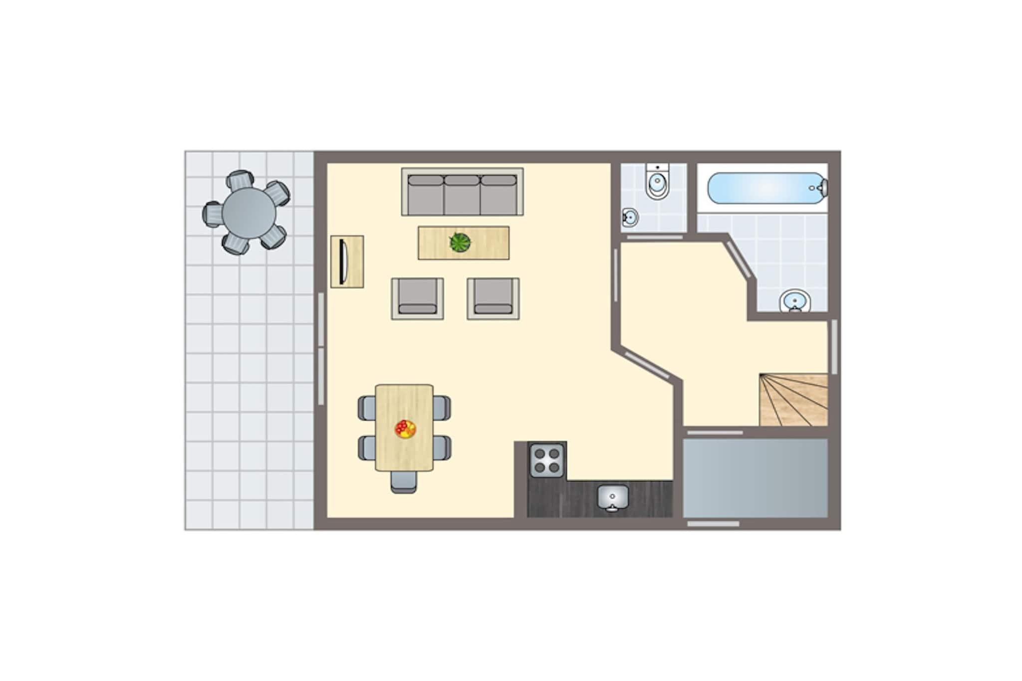 Stueetage: (entre(toilet), Stue(Fjernsyn, DVD-afspiller, radio, CD-afspiller), åbent køkken(elkedel, komfur(gas), kaffemaskine(kaffetragt, kaffepude), combi-mikroovn, opvaskemaskine , køle-fryseskab), badeværelse(badekar eller bruser, håndvask), pulterkammer(tørretumbler, vaskemaskine)) På 1. etage: (soveværelse(dobbeltseng eller 2 enkeltsenge Senge), soveværelse(dobbeltseng eller 2 enkeltsenge Senge), soveværelse(enkeltseng), Repos, pulterkammer) fortøjningsbro, terrasse, have, havemøbler, parkering, barneseng, barnestol, trappegitter