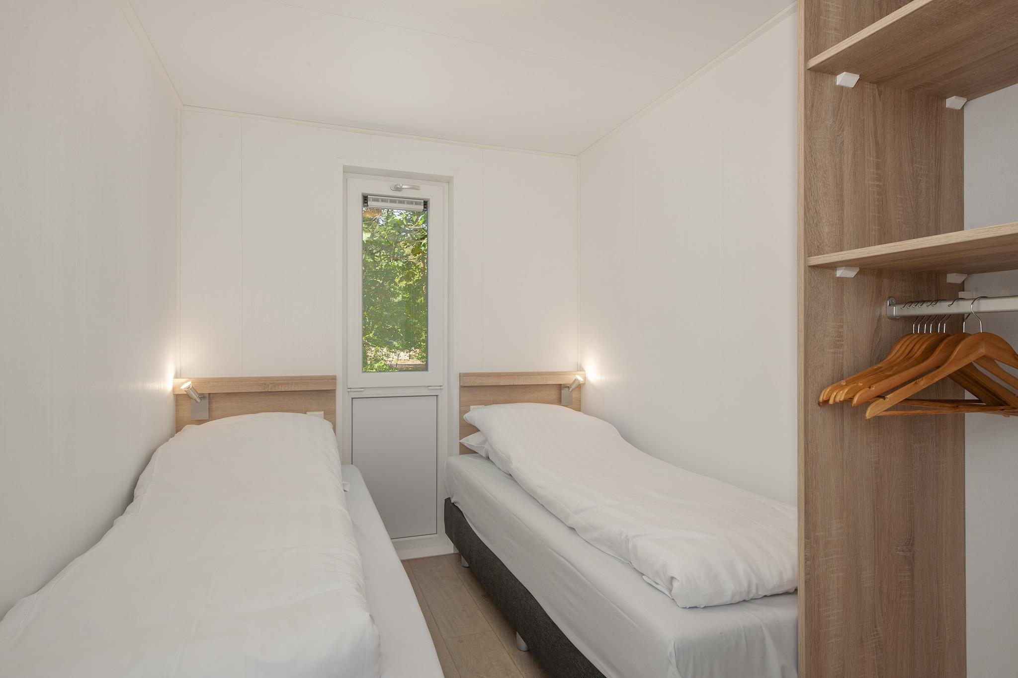 Slap af i denne moderne 4-personers hytte, der ligger i det fredelige grønne område Bospark 't Wolfsven. Denne fritliggende, nybyggede hytte kombinerer komfort og stil og har en hyggelig stue med Smart TV, et elegant åbent køkken med opvaskemaskine og kombineret mikroovn samt to rolige soveværelser med bløde boxmadrasser. Badeværelset har brusekabine, og der er separat toilet for ekstra bekvemmelighed. Kæledyr er ikke tilladt, hvilket sikrer et roligt og allergivenligt ophold for alle gæster. Lodgen ligger i hjertet af Mierlos skovrige landskab og tilbyder den perfekte balance mellem afslapning og udendørs eventyr. Parken har en fælles indendørs swimmingpool, legepladser og rolige stier lige uden for døren. Nyd din morgenkaffe på den private terrasse, mens fuglene kvidrer i nærheden, eller tilbring dine aftener under stjernerne i din egen fredelige have. Udforsk regionens kulinariske lækkerier på charmerende lokale restauranter, der ligger kun få minutter væk. Prøv Bistro de Leemer Hoef for traditionelle hollandske smagsoplevelser, eller nyd en afslappet aften på Brasserie 't Anker. Efter middagen kan du vende tilbage til din hyggelige hytte for en filmaften eller en stille drink i haven. Uanset om du er her for at slappe af, udforske eller spise godt, leverer denne elegante skovhytte det hele. Bemærk - Denne feriepark tillader fyrværkeri ved nytår. Spørg på stedet, hvor det er tilladt at affyre fyrværkeri, og vi beder dig venligst om at bortskaffe alt fyrværkeriaffald ved aftenens afslutning.