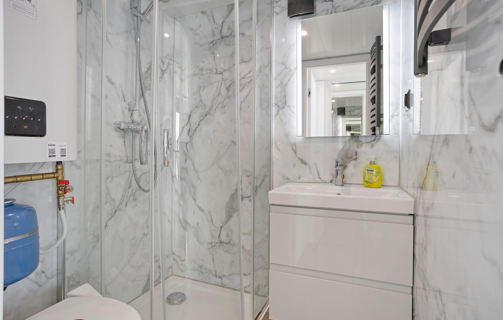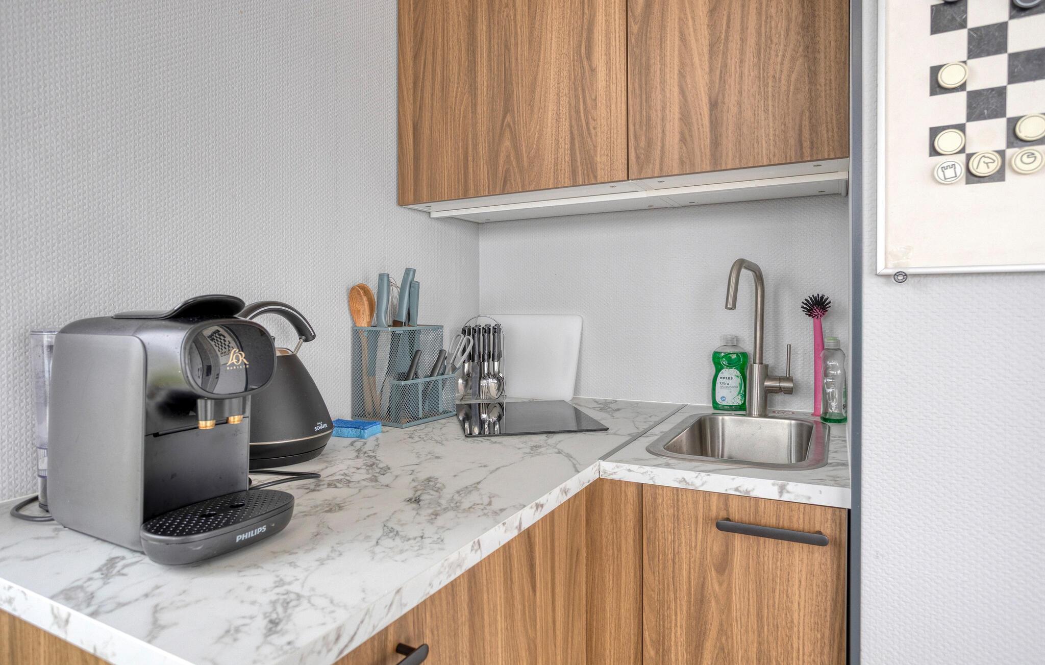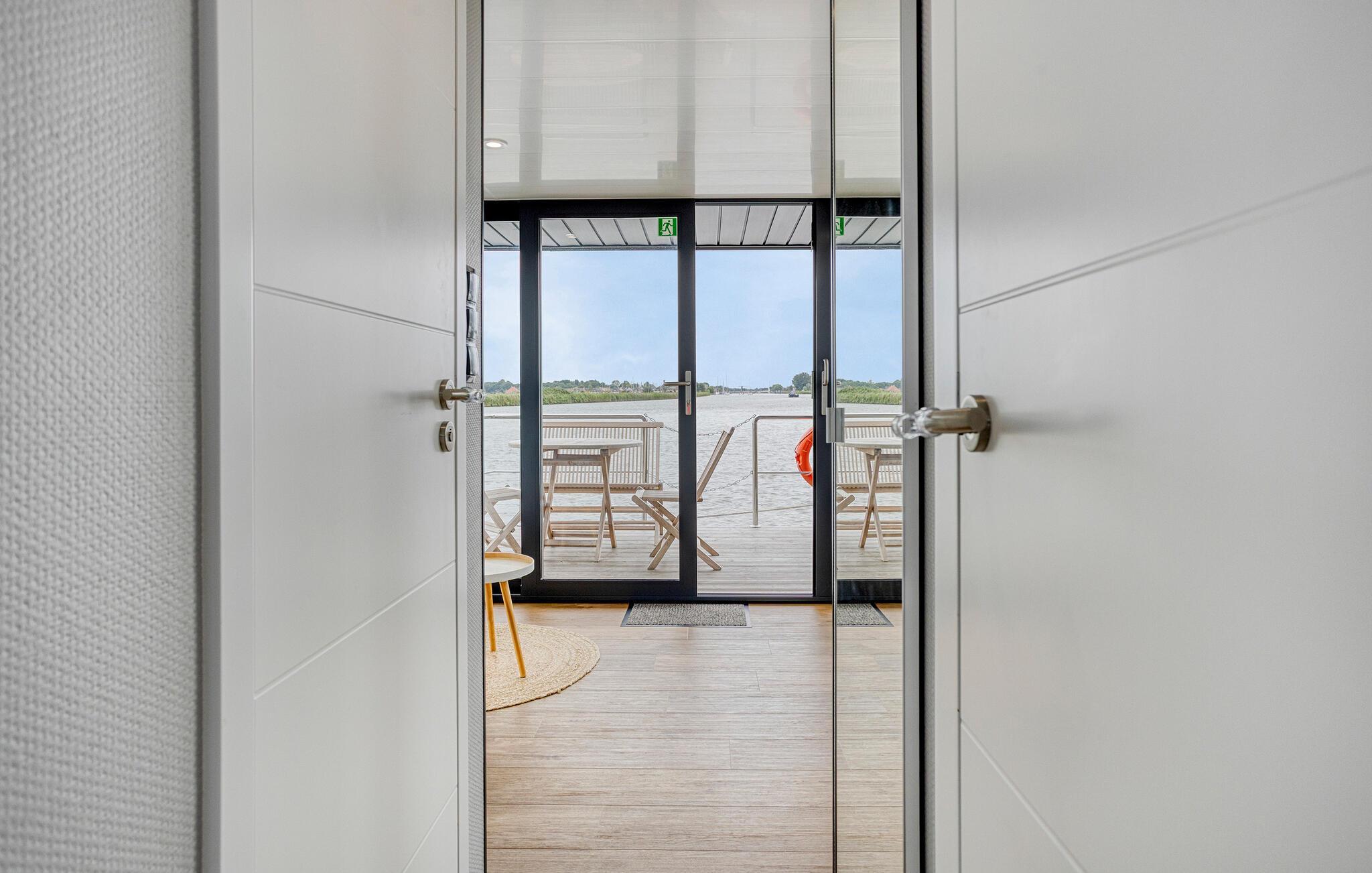 Forkæl jer selv med et afbræk fra hverdagen i en stilfuld husbåd med fri udsigt over vandet. Træd ind i det flotte opholdsrum gennem store skydedøre, og lad blikket glide ud over vandet. Kombinationen af lyst træ, rene linjer og store vinduespartier skaber en luftig, åben stemning. Slap af på den moderne sofa, og nyd en kop kaffe med udsigt til vandet. Tilbered små måltider eller snacks til jeres udflugter i det kompakte køkken.