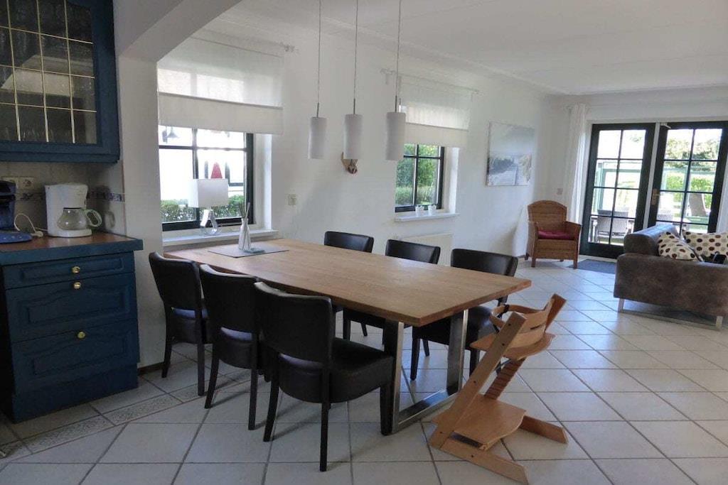 Stueetage: (Stue(Fjernsyn, kakkelovn, DVD-afspiller, CD-afspiller, varme), Køkken(tekøkken, spisebord, elkedel, brødrister, komfur, kaffemaskine, ovn, mikrobølgeovn, opvaskemaskine , køleskab, fryser, varme), badeværelse(toilet, håndvask, varme), pulterkammer(, vaskemaskine, tørreskab)) På 1. etage: (soveværelse(, dobbeltseng), soveværelse(, enkeltseng, enkeltseng, enkeltseng), badeværelse(, toilet, badekar, bruser, håndvask, varme)) , , , Internetadgang, vaskemaskine, varme, terrasse(, havemøbler, solstole), terrasse(, havemøbler, solstole), trappegitter, tørreskab,