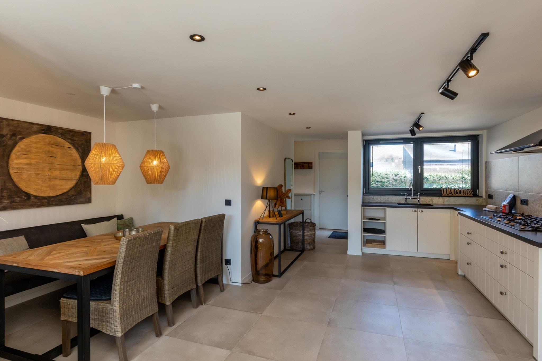 Leder du efter den perfekte gruppeferie? Lepelblad 42 & 44 i Nieuwvliet kan bookes sammen, hvilket skaber en stor 10 meter lang terrasse til 14 gæster. Haus Strandliebe (hus 1) er et industrielt-moderne fristed med varme træ- og rattan-detaljer. Den åbne stue har pejs, plads til seks personer ved spisebordet og store skydedøre, der fylder rummet med lys. Køkkenet har en 5-blus gaskomfur, kombi-mikroovn, ovn, opvaskemaskine og kaffemaskiner. I stueetagen er der et soveværelse med en dobbeltseng (160x200 cm) og et badeværelse. Ovenpå er der yderligere to soveværelser – et med en dobbeltseng og et med to enkeltsenge – samt et andet badeværelse. Haven har en terrasse, græsplæne, hegn og to parkeringspladser. Hus 2 er fuldstændig renoveret og ligger kun få skridt fra stranden. Den rummelige stue går over i det åbne køkken med 6-blus komfur, køleskab, fryser, ovn og kaffemaskine. Der er et separat tv-værelse, sauna og bryggers med vaskemaskine og tørretumbler. I stueetagen er der et stort badeværelse med brusekabine og toilet, og på første sal er der tre soveværelser – to med dobbeltsenge og et med køjesenge – samt et andet badeværelse. Haven har en terrasse, liggestole og plads til børnene at lege. WiFi er inkluderet. Begge huse ligger i ferieparken St. Pierre bag klitterne, tæt på legepladser, bageri, restauranter, cykeludlejning og stranden. Udforsk Zeelandic Flanders strande, klitter og naturreservater, eller besøg det nærliggende Cadzand, det historiske Brugge, Gent eller Knokke. Nyd solbadning, gåture, vandsport og lokale delikatesser som Zeeland-muslinger, alt inden for rækkevidde.