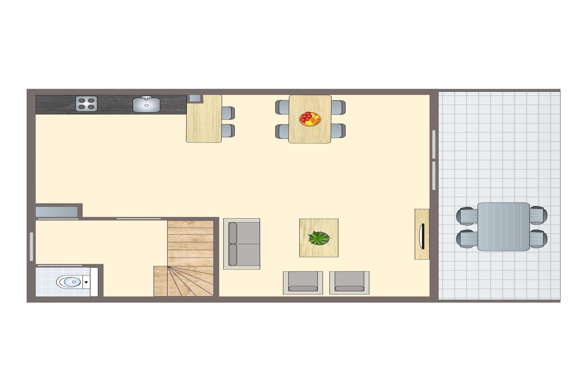 Stueetage: (entre(toilet), Stue(Fjernsyn), åbent køkken(elkedel, komfur(gas), kaffemaskine(kaffetragt, kaffepude), ovn, mikrobølgeovn, opvaskemaskine , køle-fryseskab)) På 1. etage: (Soveværelse med badeværelse(dobbeltseng eller 2 enkeltsenge Senge, Fjernsyn, badekar med bruser, håndvask), Soveværelse med badeværelse(dobbeltseng eller 2 enkeltsenge Senge, bruser, håndvask), Repos(toilet)) terrasse, have, havemøbler, swimmingpool(deles med andre gæster, overdækket), barneseng, barnestol