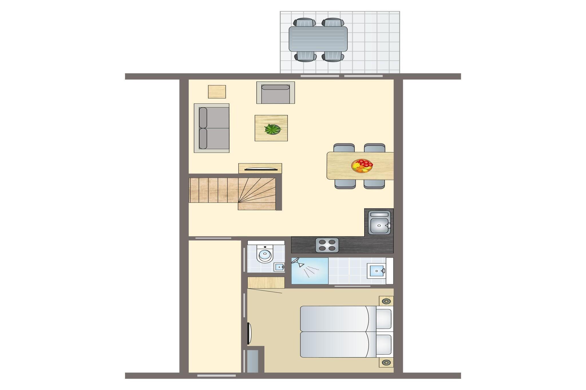Stueetage: (entre(toilet), Stue(Fjernsyn), åbent køkken(elkedel, komfur(gas), kaffemaskine(kopper, kaffetragt), ovn, mikrobølgeovn, opvaskemaskine , køleskab), Soveværelse med badeværelse(dobbeltseng eller 2 enkeltsenge Senge, Fjernsyn, bruser med lysterapi, håndvask)) På 1. etage: (soveværelse(dobbeltseng eller 2 enkeltsenge Senge, sauna), badeværelse(badekar med bruser, håndvask, toilet), Repos, pulterkammer(vaskemaskine)) terrasse, have, havemøbler, liggestole, swimmingpool(deles med andre gæster, overdækket), barneseng, barnestol