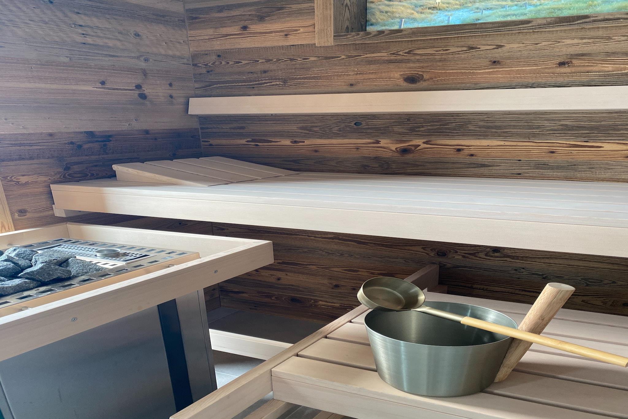 Stueetage: (Stue(sofahjørne), fjernsynsstue(Fjernsyn(fladskærm, Smart-TV), sofahjørne), Køkken(spisebord, elkedel, komfur(gas), kaffemaskine, ovn, køleskab, fryser)) På 1. etage: (soveværelse(dobbeltseng), soveværelse(dobbeltseng), soveværelse(køjeseng), badeværelse(bruser(Walk-in-bruser), håndvask, toilet), vaskerum (tørretumbler, vaskemaskine)) sauna(badekar, håndvask), terrasse, have, havemøbler, parkering, Gyngestativ