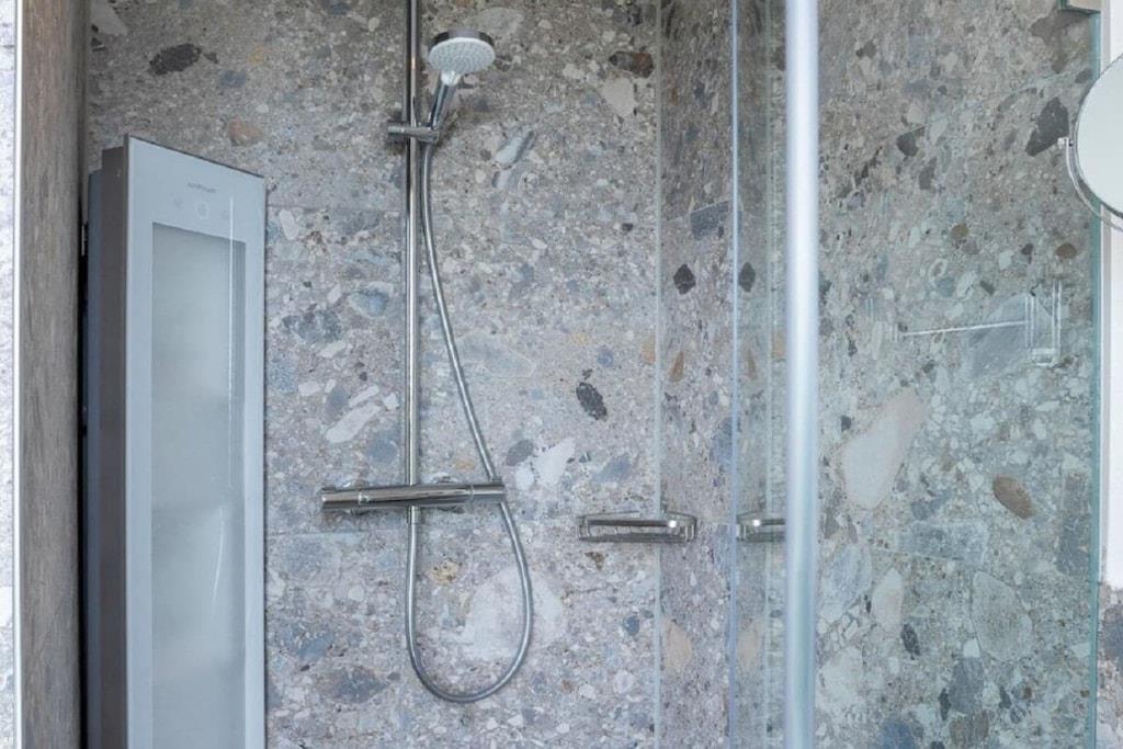 Du har udsigt til den rummelige terrasse, som er tilgængelig gennem de store glasdøre. Spiseområdet er forbundet med det rummelige åbne køkken med kogeø og moderne apparater. Soveværelset har en vask.