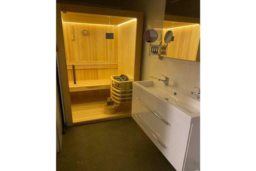 Stueetage: (stue / spisestue(, Fjernsyn, spisebord, kakkelovn), soveværelse(, dobbeltseng, Fjernsyn, radio), badeværelse(, bruser, håndvask), guest toilet(, toilet, håndvask), loungerum(sauna)) , , , , , Internetadgang, Internetadgang, varme, terrasse(, havemøbler, solstole), terrasse(, havemøbler, solstole), parkering, tørreskab, Ladestation til el-biler