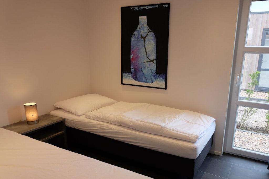 Newly built in 2019, the chalet is elegant and stylish, yet functional and meticulously planned down to the last detail. The large glass area in the living area and the raised ceilings provide plenty of light and lend the house a cozy atmosphere. There is a bedroom with a double bed and separate dressing area, and another bedroom with two single beds. Both bedrooms have direct access to the bathroom. The toilet is accessible separately from the hallway. The kitchen is very well equipped with a Senseo coffee machine, kettle, dishwasher, combination microwave and oven, and a large refrigerator with a freezer compartment. For our holiday home with an electric motorboat, a Happy Boats electric motorboat with a maximum speed of 20 km/h (and therefore does not require a license) is available for you in the harbor (for one day per three overnight stays). After a brief briefing by the on-site staff, you can look forward to a wonderful tour on the water.