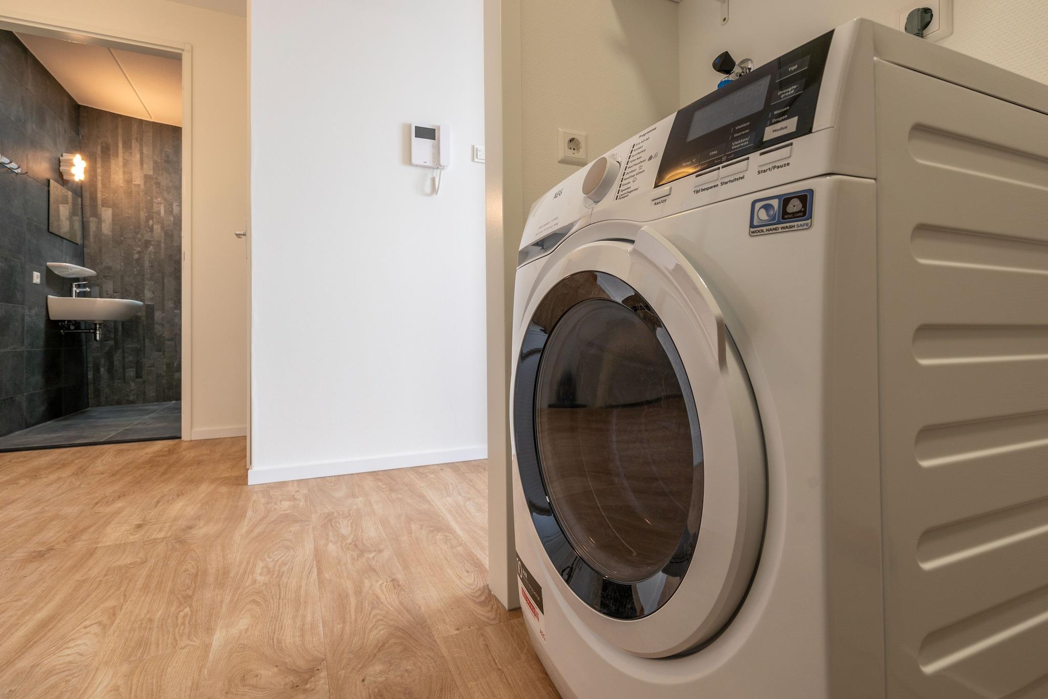 Stueetage: (pulterkammer(cykelopbevaring), parkering) På 4. etage: (entre(elevator), åbent køkken(kogeplade(Komfur med fire kogeplader, induktion), elkedel, brødrister, emhætte, combi-mikroovn, opvaskemaskine , køleskab(+ fryser)), stue / spisestue(Fjernsyn(fladskærm, Smart-TV, Hollandske TV-kanaler, Tyske TV-kanaler, Internationale TV-kanaler), spisebord, sofahjørne), soveværelse(dobbeltseng(boxmadras, 180 x 200 cm)), soveværelse(enkeltseng(boxmadras, 90 x 200 cm), enkeltseng(boxmadras, 90 x 200 cm)), badeværelse(bruser(Walk-in-bruser), håndvask), toilet(håndvask), pulterkammer(tørretumbler, vaskemaskine)) spisebord, terrasse, Ladestation til el-biler