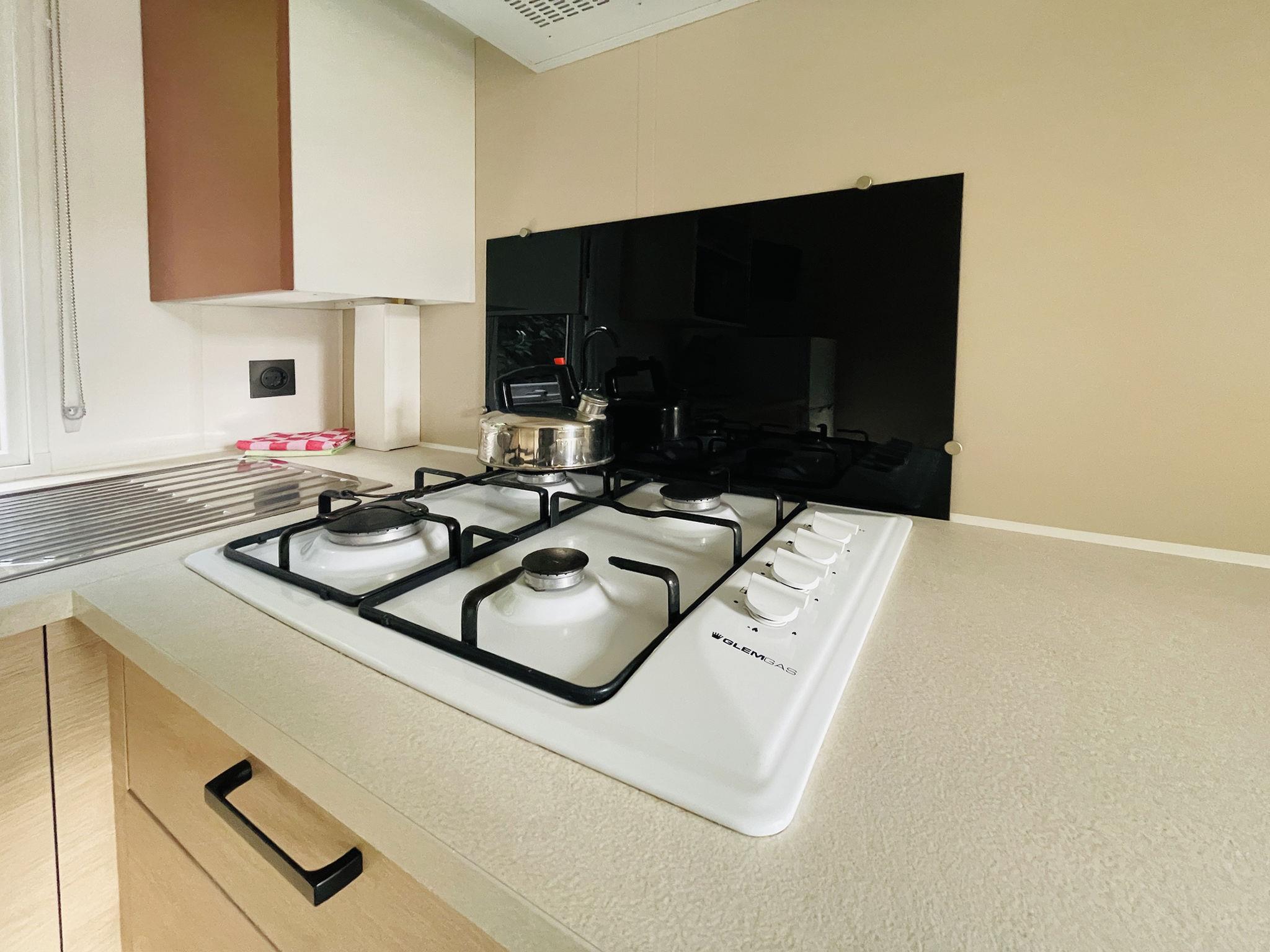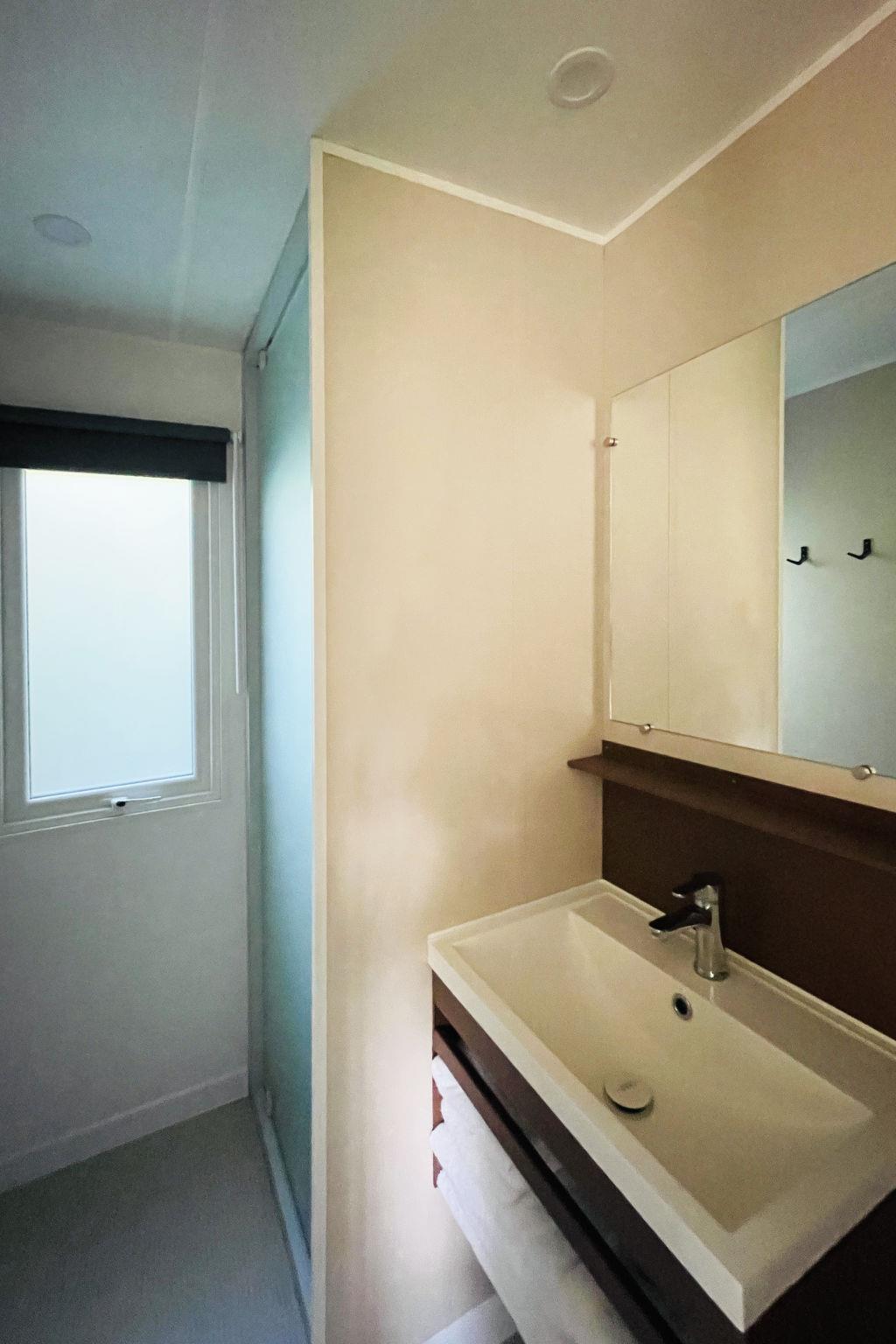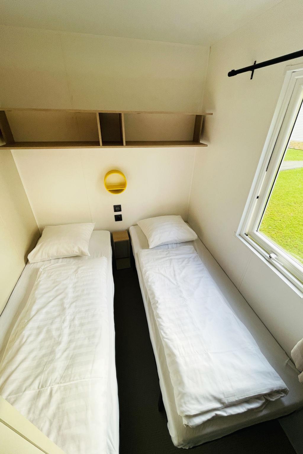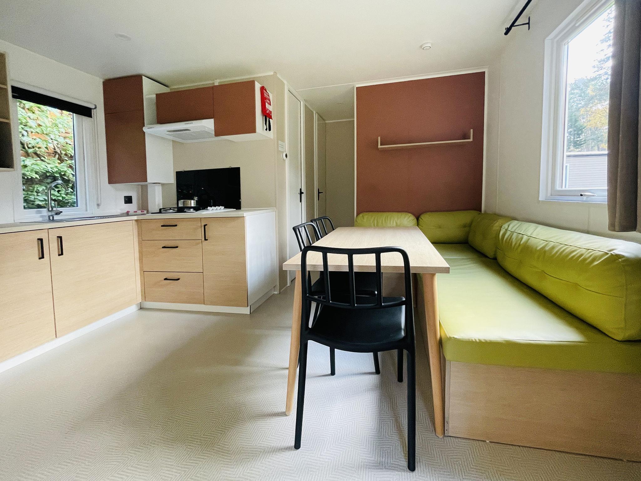 "Family 6 persoons", 3-room mobile home 32 m2. Comfortable furnishings: entrance hall with separate WC. 1 double bedroom with 1 double bed. 2 double bedrooms, each room with 2 beds. Open kitchen (4 gas rings, kettle, microwave, electric coffee machine) with dining nook and TV. Exit to the terrace. Shower. Heating. Terrace. Terrace furniture. Facilities: Internet (WiFi, free). Parking (1 car) at the house. Please note: non-smoking house. Smoke alarm.