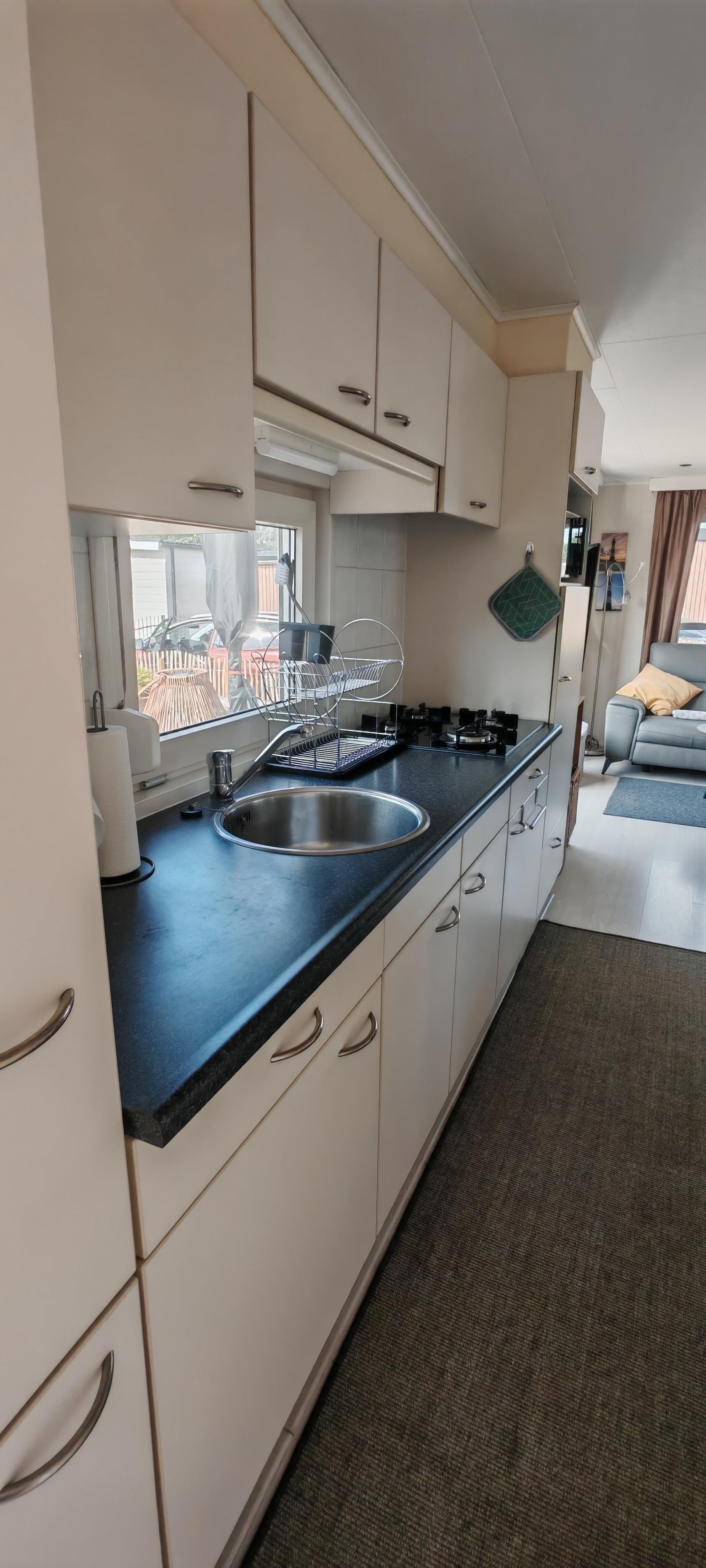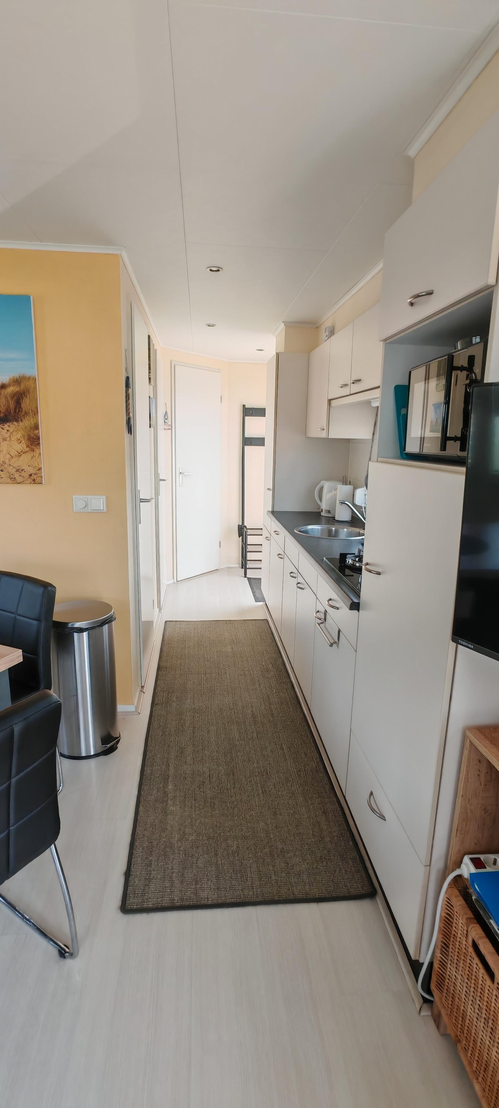 Die Küche ist komplett ausgestattet mit Gas-Kochfeld, Mikrowelle, Heißluftfriteuse, Senseo-Kaffeemaschine, Wasserkocher, Toaster, Kühl/Gefrierschrank und natürlich Geschirr, Besteck, Töpfe, Pfannen, usw.