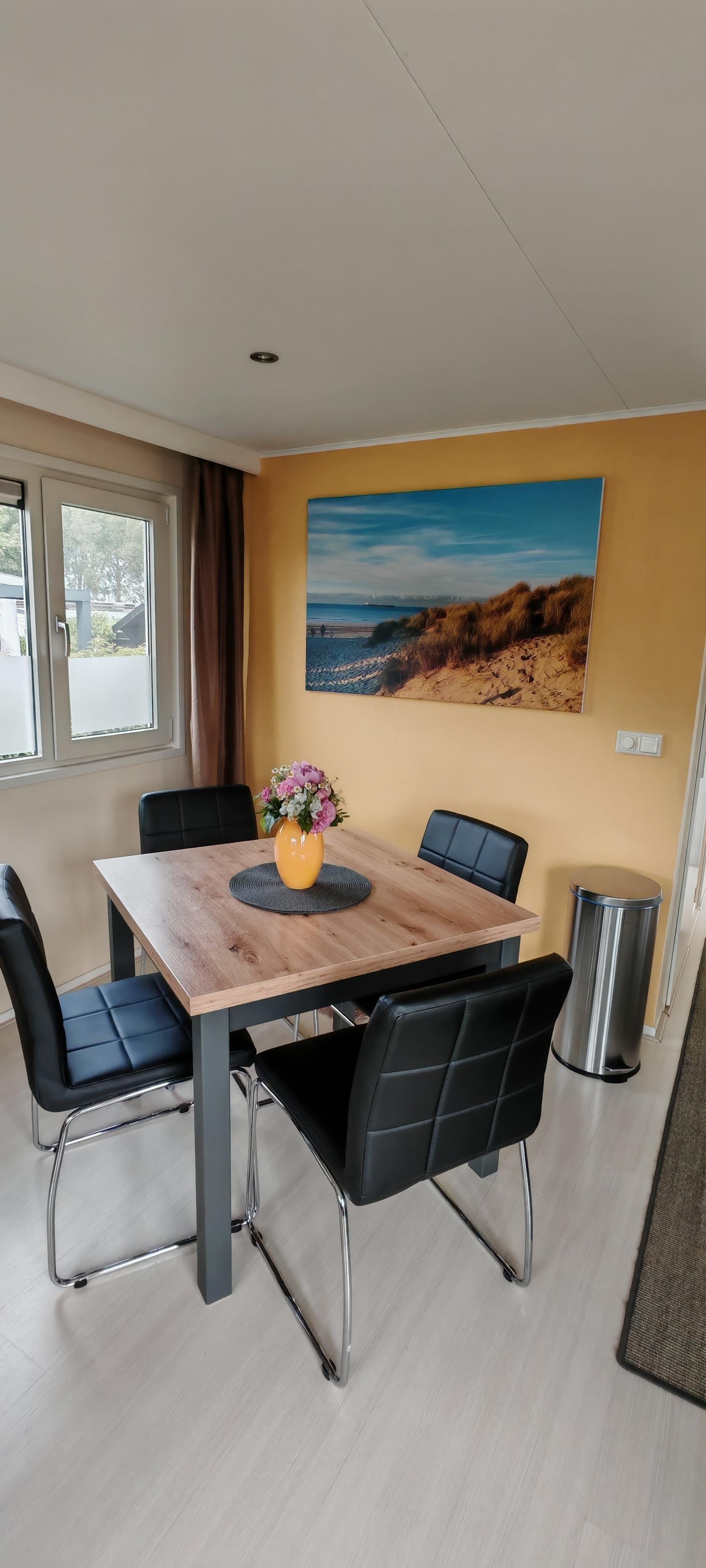Angrenzend eine gemütliche Essecke mit Tisch und bequemen Kunstleder Stühlen.