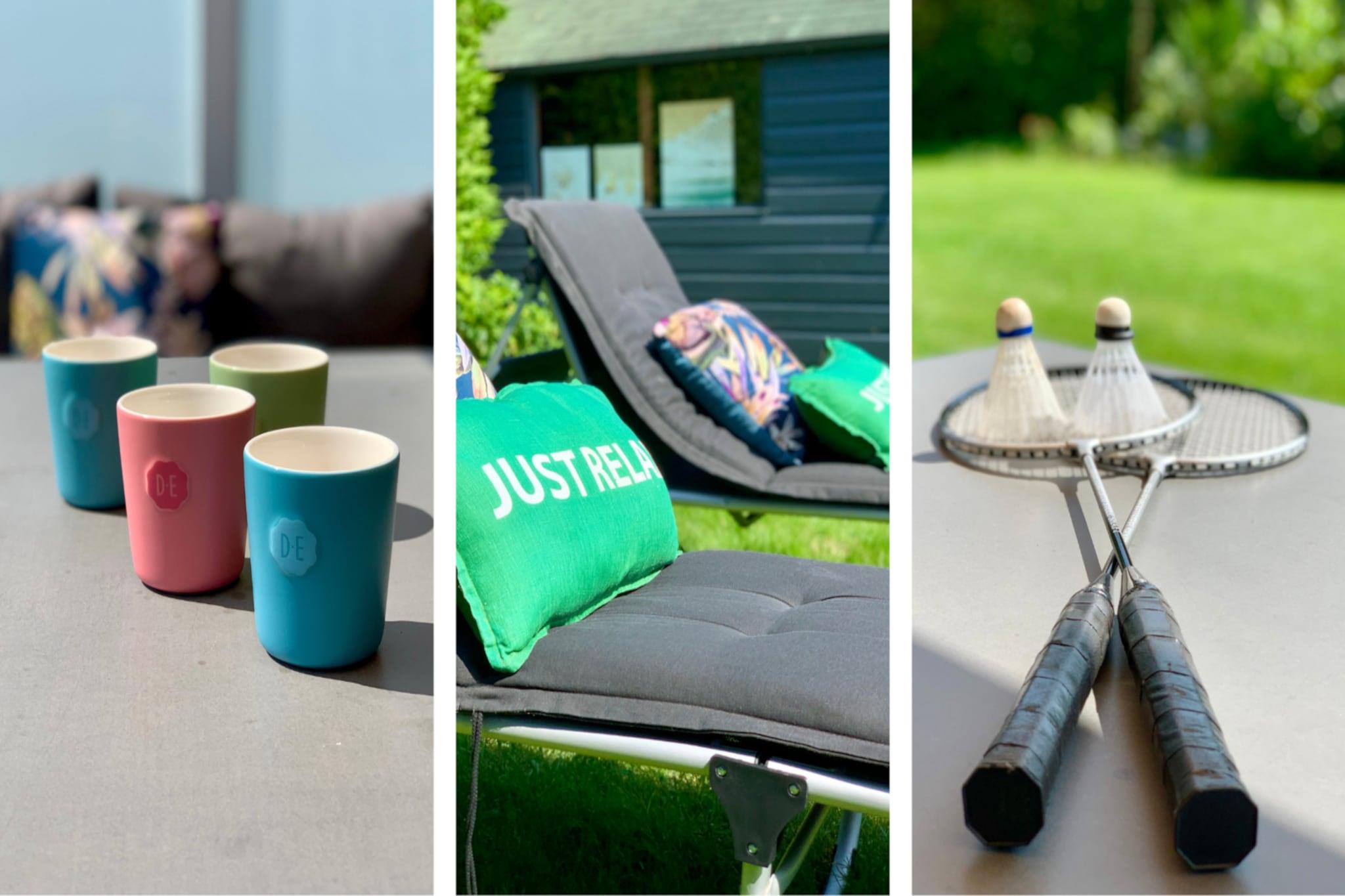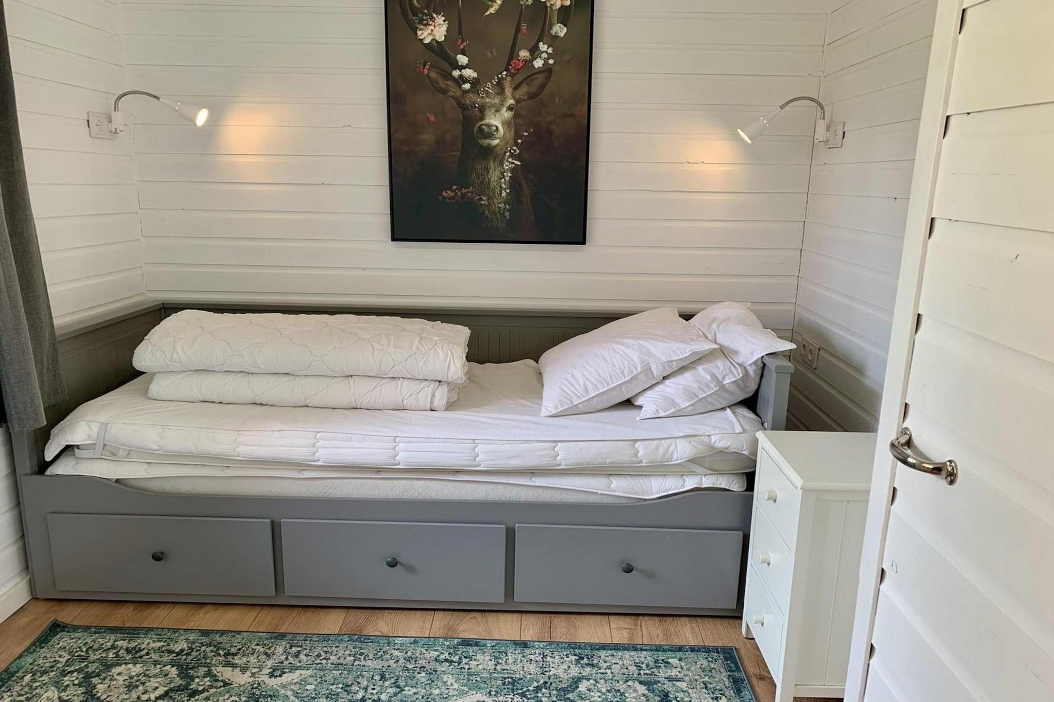 Stueetage: (Stue(Fjernsyn(fladskærm, digital), sofahjørne, CD-afspiller), åbent køkken(kakkelovn(gas), brødrister, kaffemaskine, ovn, grill, køleskab), soveværelse(dobbeltalkove), soveværelse(dobbeltseng(160 x 200 cm)), badeværelse(bruser, håndvask, toilet)) pulterkammer, køleskab, vaskemaskine, terrasse, have, have, cykelopbevaring, solstole, parkering, gaspejs, loungemøbler