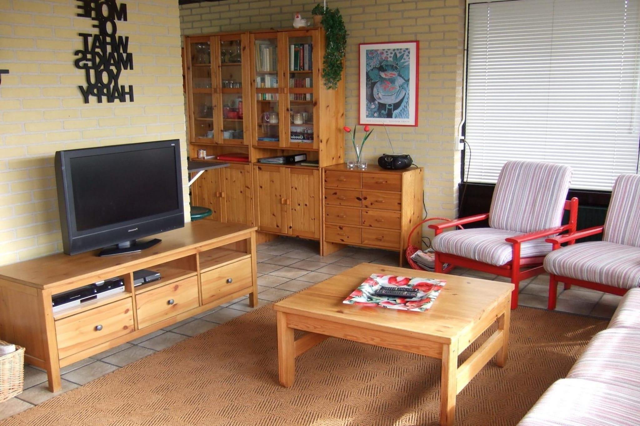 Stueetage: (Stue(Fjernsyn(digital), sofahjørne, DVD-afspiller, CD-afspiller), åbent køkken(spisebord, kakkelovn(gas), elkedel, brødrister, kaffemaskine, ovn, opvaskemaskine , køle-fryseskab), soveværelse(dobbeltseng), soveværelse(enkeltseng, enkeltseng), badeværelse(bruser, håndvask), toilet(toilet)) vaskemaskine, varme(central), terrasse, have(indhegnet), havemøbler, solstole, strygejern