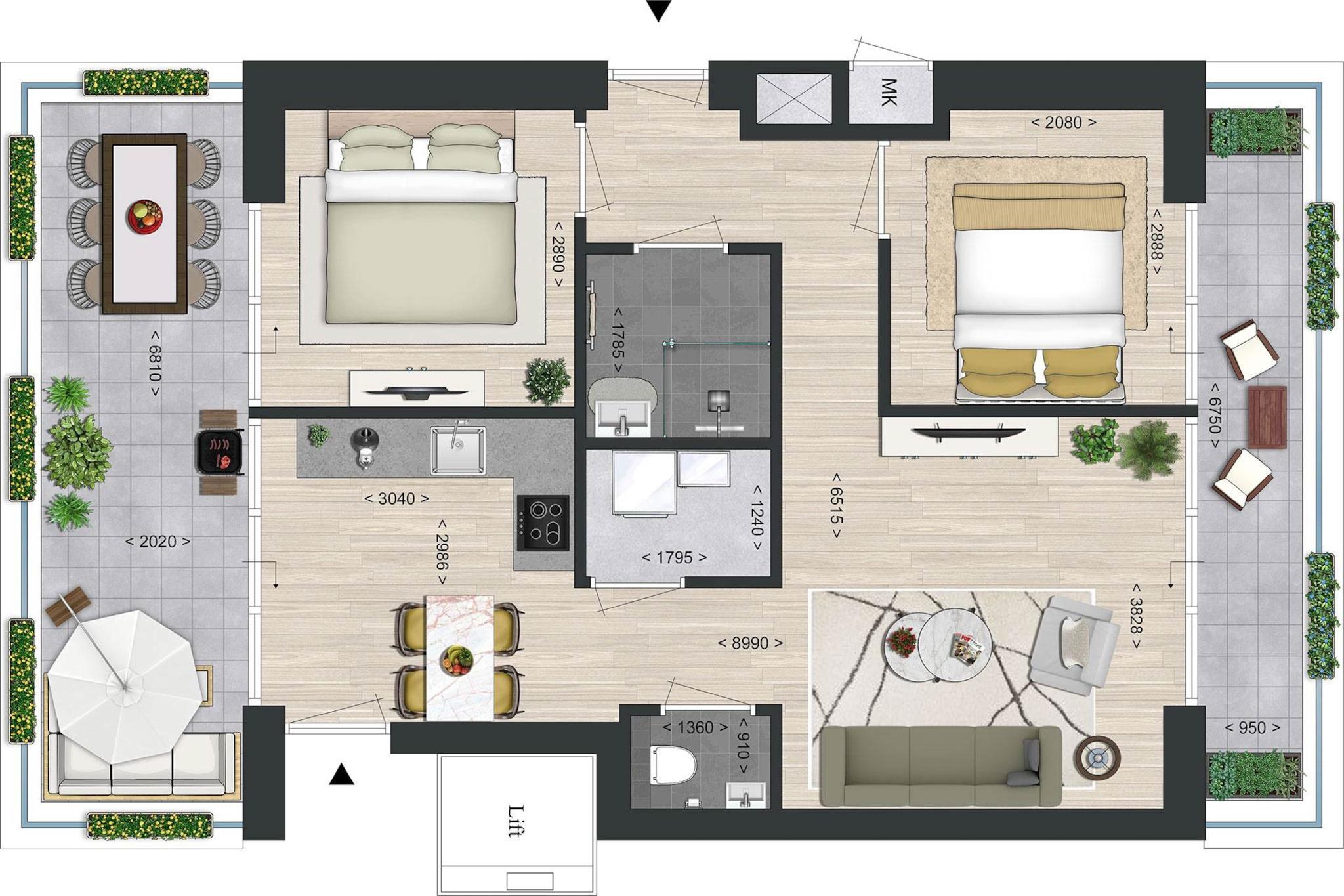 På 1. etage: (Stue(sofahjørne, sofahjørne), Køkken(elkedel, komfur, kaffemaskine, combi-mikroovn, opvaskemaskine , køle-fryseskab), soveværelse(dobbeltseng), soveværelse(dobbeltseng), badeværelse(bruser, håndvask), toilet(toilet), balkon eller terrasse, klimaanlæg) parkering