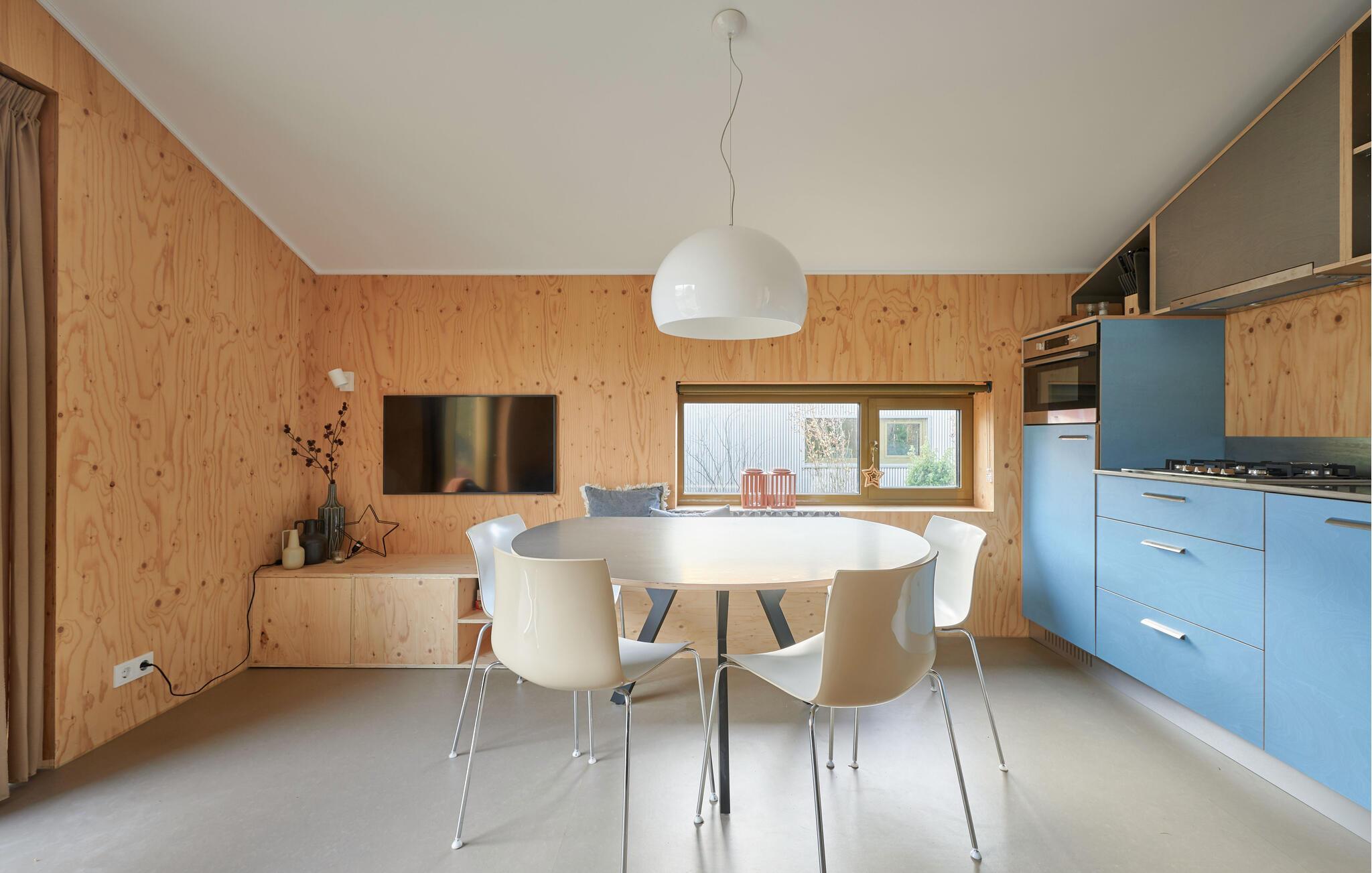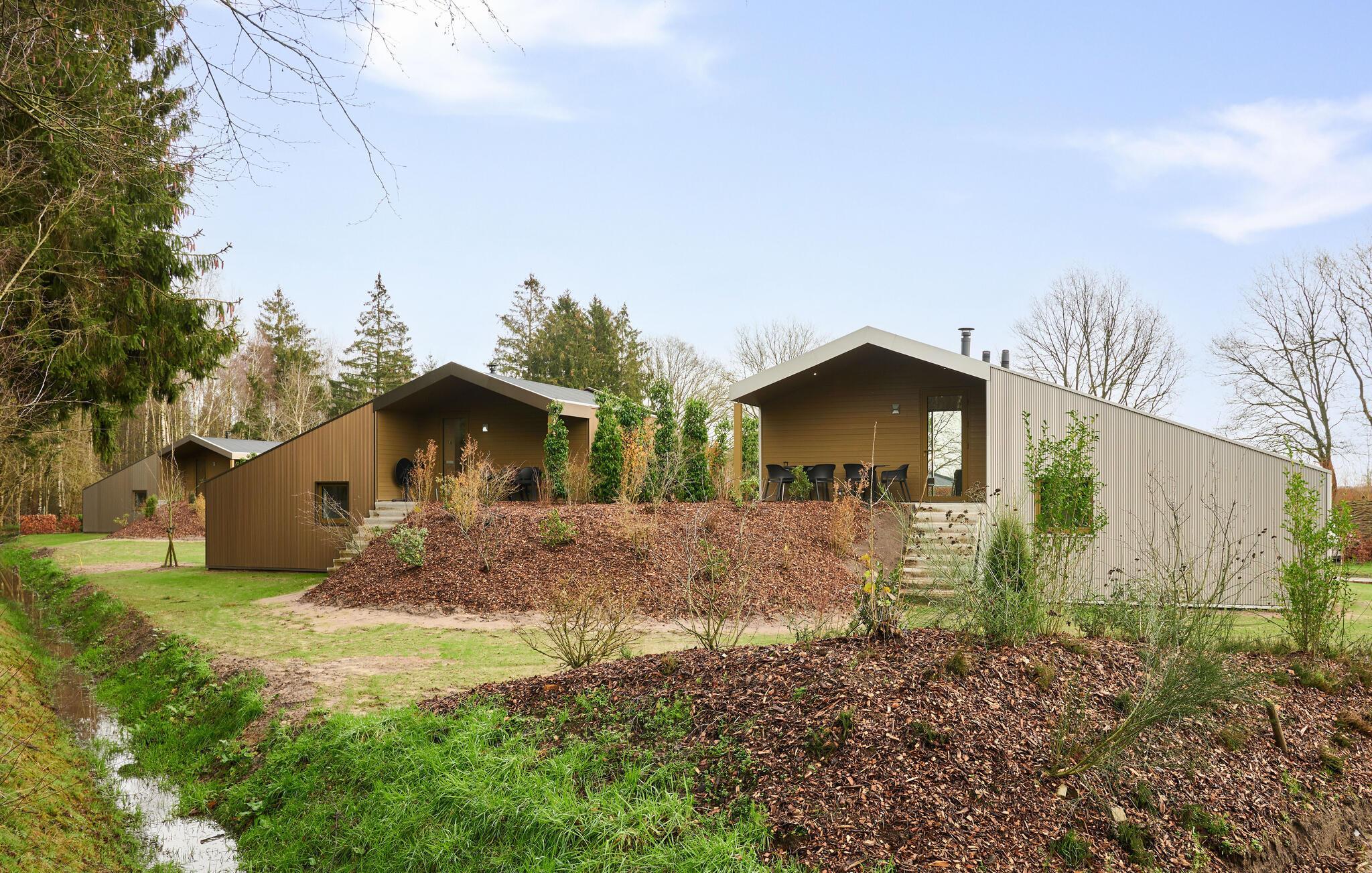 Velkommen til dette indbydende og moderne tre-etagers hjem. Det arkitektonisk legende design byder på en unik rumlig oplevelse og er omhyggeligt indrettet i en moderne og minimalistisk stil. Her kan I undslippe hverdagens stress og jag og slappe helt af i smuk natur. Det farverige, fuldt udstyrede køkken lægger op til at tilberede lækre måltider. Saml jer om det særlige spisebord, slap af i sofaen med en god film eller nyd varmen fra brændeovnen om aftenen. Fra stuen har man en smuk udsigt over skoven og naturreservatet Terhorsterzand med sine heder, skove og hede.