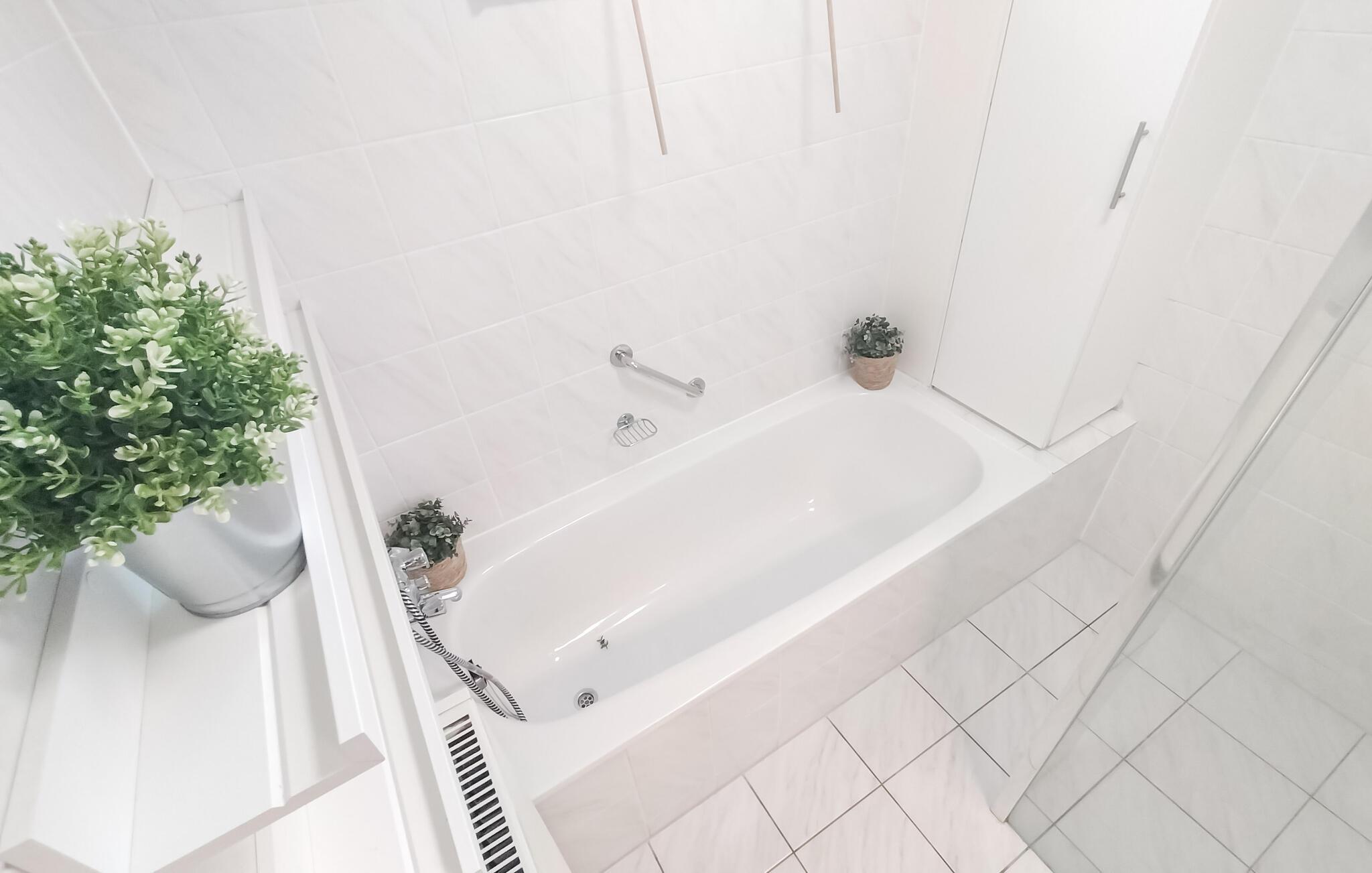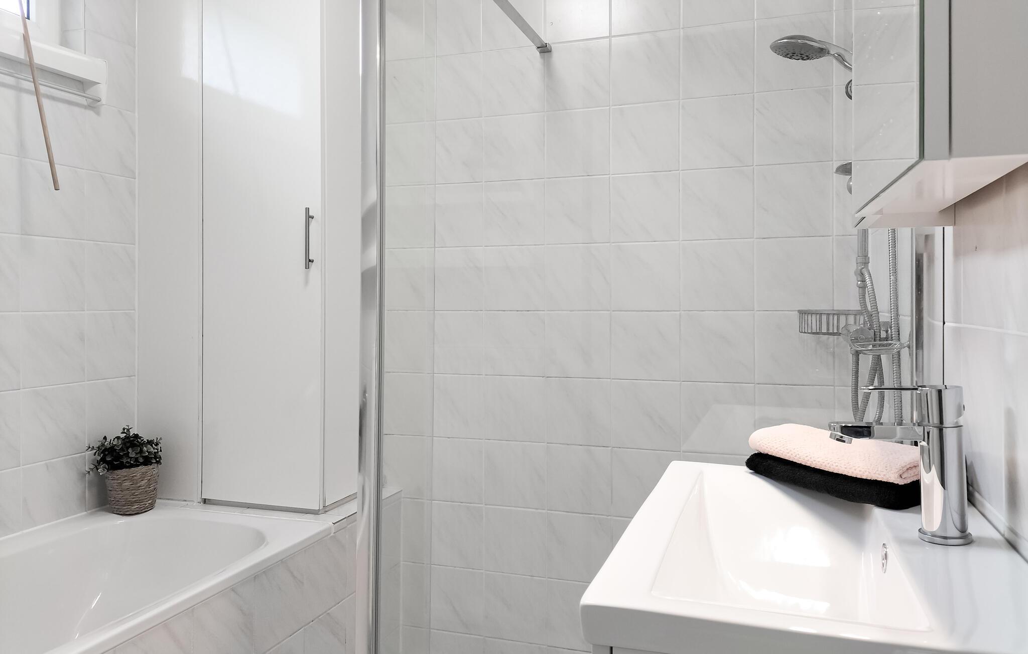 Badeværelse (nr. 1) - Varmt og koldt vand. Håndbruser, badekar og bruser