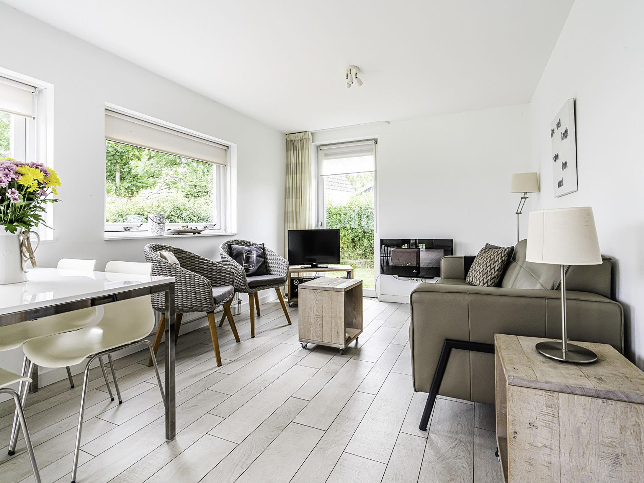 "Sand & Dunes nr. 32", 3-room bungalow. Bright, comfortable furnishings: living room with open-hearth fireplace (only for decoration), TV. Exit to the terrace. Open kitchen (dishwasher, 1 induction hot plates, kettle, freezer, electric coffee machine, combination microwave) with dining table. Sep. WC. Heating, floor heating. Upper floor: (spiral staircase) with sloping ceilings, 2 rooms, each room with 2 beds (80 cm, length 200 cm). Shower/WC. Terrace. Terrace furniture. Facilities: washing machine. Internet (WiFi, free). Parking (1 car). E-charging station. Please note: non-smokers only. Maximum 2 pets/ dogs allowed. Smoke alarm.