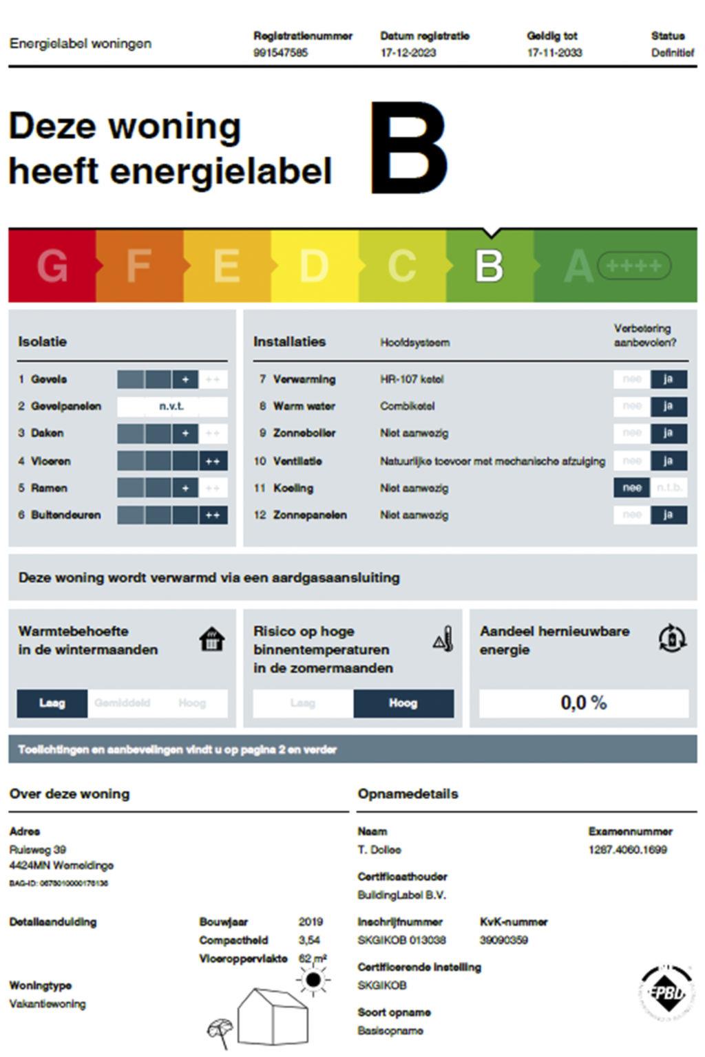 "Ruisweg 39", 3-room house 70 m2. Comfortable and modern furnishings: entrance hall with separate WC. Living/dining room with dining table, flat screen and CD-player. Exit to the terrace. 2 double bedrooms, each room with 2 beds (80 cm, length 200 cm). Open kitchen (dishwasher, 4 induction hot plates, toaster, kettle, electric coffee machine, combination microwave). Shower. Heating. Terrace. Terrace furniture, box-room. View of the countryside. Facilities: Internet (WiFi, free). Parking (1 car) at the house. Please note: non-smoking house. Smoke alarm. The gas fireplace can be used during the colder months. Bookings accepted for holiday purposes only. A deposit of 100 EUR per person can be charged on site.