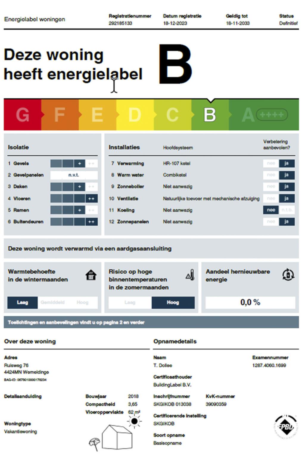 "Ruisweg 76", 3-room bungalow. Entrance hall with separate WC and shower. Living/dining room with dining table, flat screen and radio. Exit to the terrace. 1 double bedroom with 2 beds (80 cm, length 200 cm). 1 double bedroom with 1 double bed (160 cm, length 200 cm). Open kitchen (oven, dishwasher, 4 induction hot plates, kettle, microwave, freezer, electric coffee machine). Exit to the terrace. Heating. Terrace. Terrace furniture, deck chairs (2), box-room. Facilities: washing machine. Internet (WiFi, free). Parking (fenced 1 car) at the house. Please note: non-smoking house. Smoke alarm. The gas fireplace can be used during the colder months. Bookings accepted for holiday purposes only. A deposit of 100 EUR per person can be charged on site.
