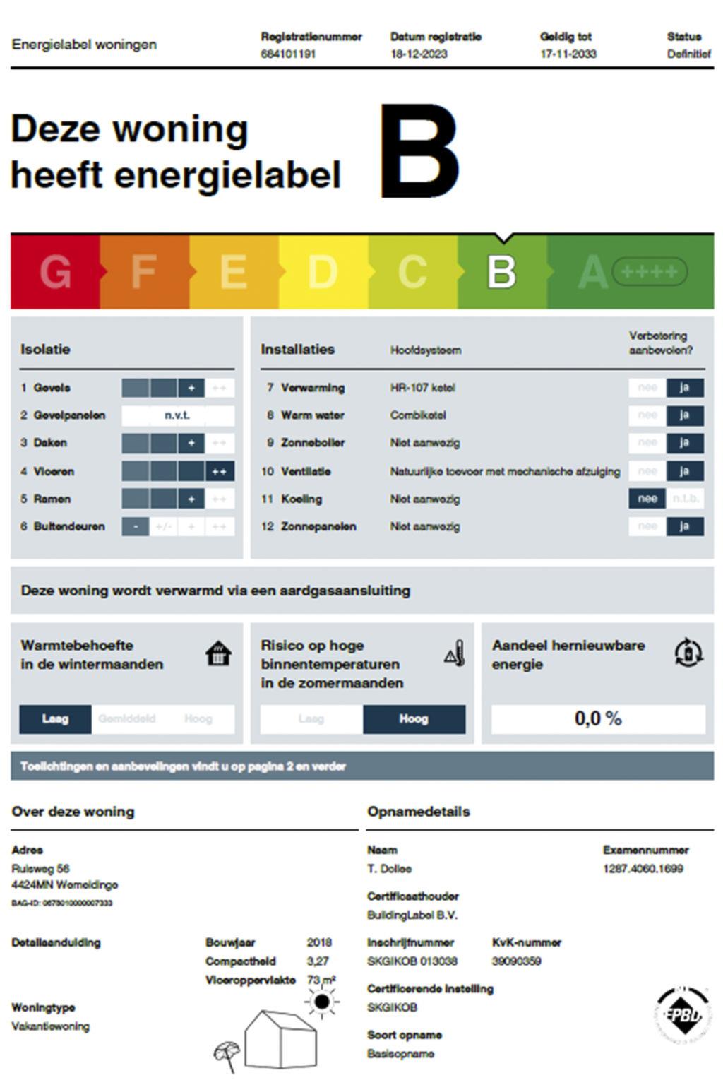 "Ruisweg 56", 3-room bungalow 83 m2. Comfortable and modern furnishings: entrance hall with separate WC. Living/dining room with dining table and flat screen. Exit to the terrace. 1 double bedroom with 1 double bed. Exit to the terrace. 1 double bedroom with 2 beds. Exit to the terrace. Open kitchen (oven, dishwasher, 4 induction hot plates, toaster, kettle, freezer, electric coffee machine, combination microwave). Shower. Heating. Terrace. Terrace furniture, deck chairs (2), box-room. View of the lake. Facilities: washing machine, dryer, hair dryer. Internet (WiFi, free). Parking (2 cars) at the house. Please note: non-smoking house. Smoke alarm. The gas fireplace can be used during the colder months. Bookings accepted for holiday purposes only. A deposit of 100 EUR per person can be charged on site.