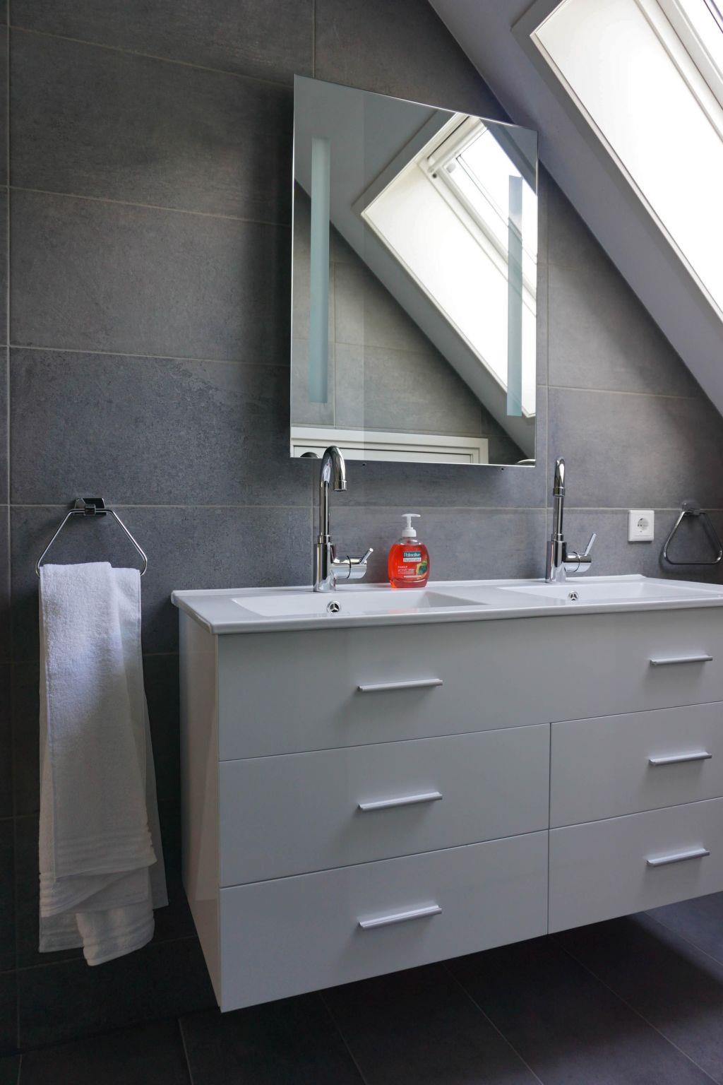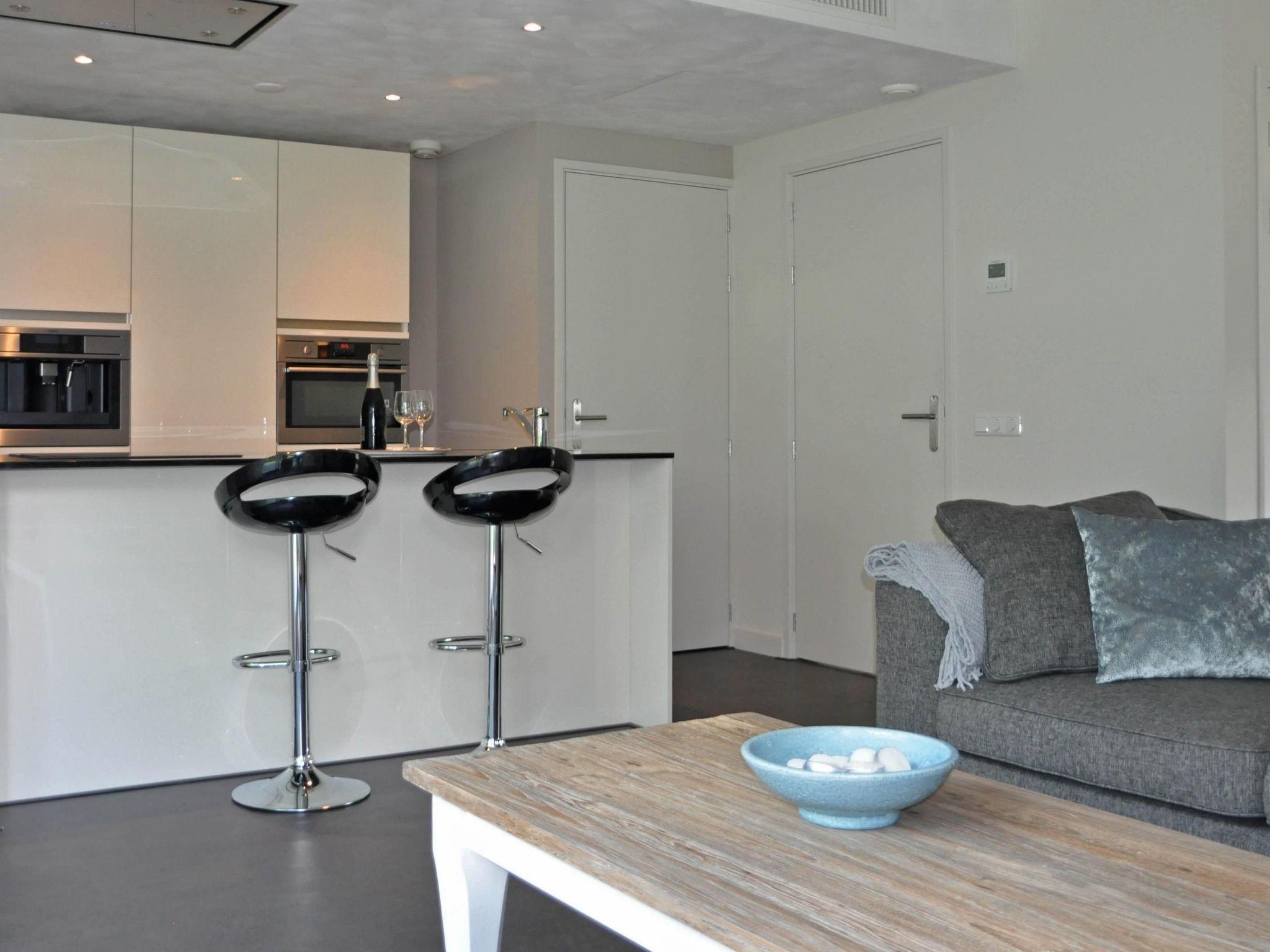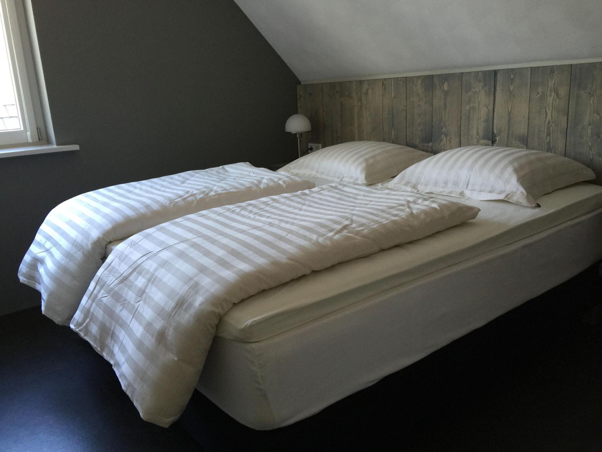 The two halves of the house are each spread over two floors and can accommodate up to four people. The house has a living room with open-plan kitchen and toilet on the ground floor; on the upper floor there are two bedrooms, a bathroom and a separate toilet. The living room is furnished with a sofa, a TV and a dining table. The kitchen is well equipped with plenty of cutlery and crockery. The two bedrooms each have a 180 cm x 200 cm double bed. The bathroom has a shower and two sinks. The toilet on the upper floor is separate.