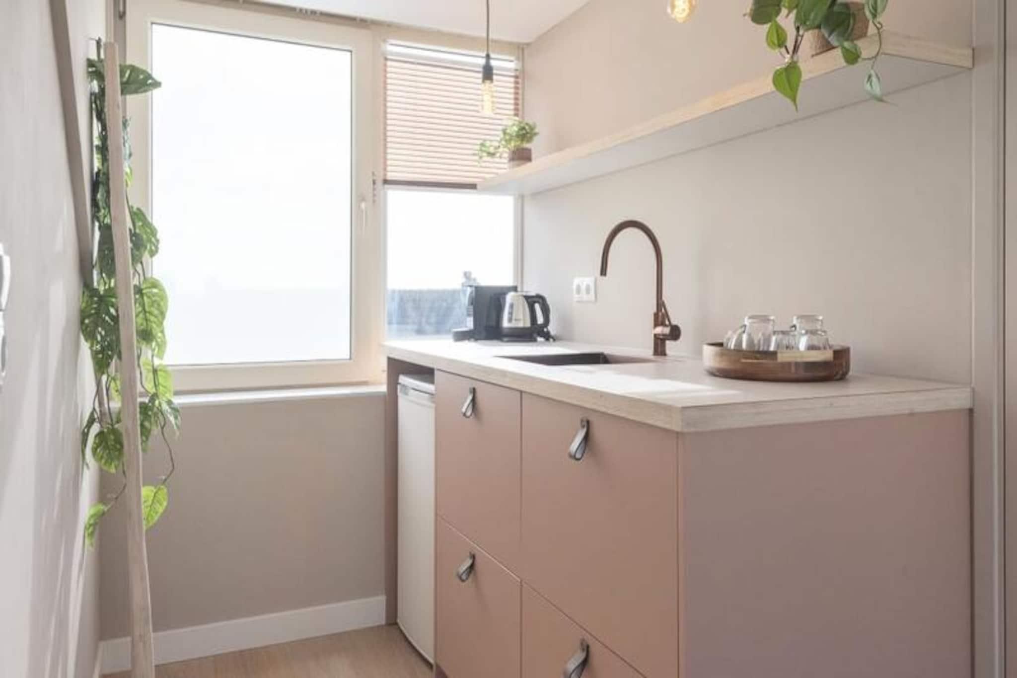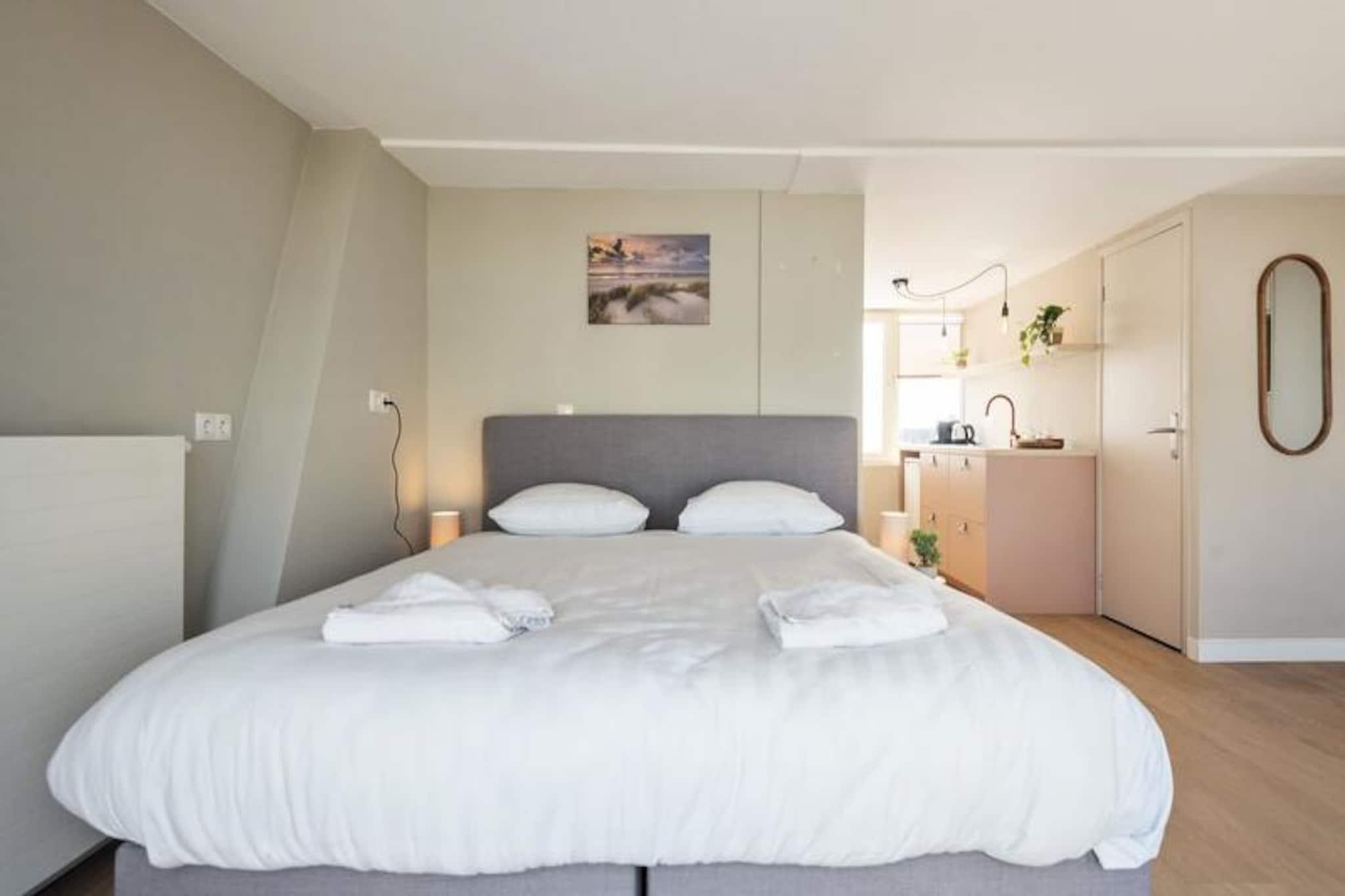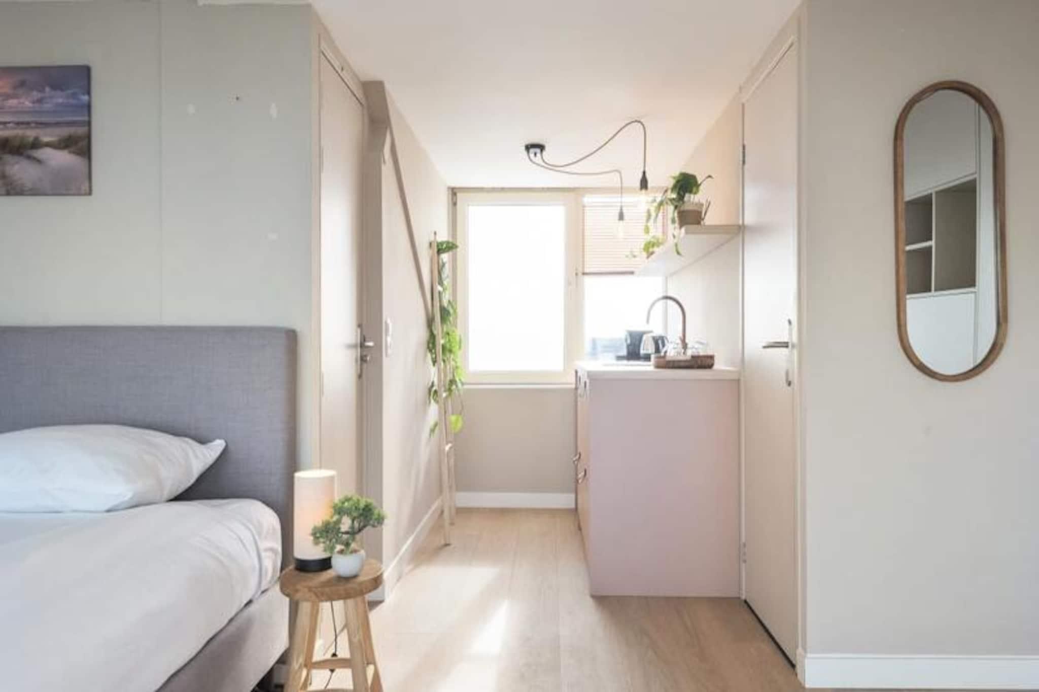 Vågn op til den beroligende lyd af bølger og solopgangens gyldne nuancer i dette elegante studio i loftstil i Zandvoort. Beliggende på anden sal i et moderne hus gemt væk på en rolig gade bag den travle boulevard, tilbyder dette private tilflugtssted en harmonisk blanding af ro og pulserende kystcharme. Kun få minutter fra klitterne og det livlige bycentrum er det en ideel base for at udforske den hollandske kysts skønhed. \n\nTræd indenfor for at finde et lyst og luftigt rum, omhyggeligt designet til at maksimere komfort og stil. Store vinduer på begge sider oversvømmer studioet med naturligt lys, hvilket skaber en varm og indbydende atmosfære. Kingsize-sengen lover afslappende nætter, mens tekøkkenet giver dig mulighed for at tilberede lette måltider, når det passer dig. Det tilhørende badeværelse, udsmykket med terrazzogulv og kobberfarvede armaturer, tilføjer et strejf af elegance til dit ophold. Aircondition, Wi-Fi og et tv sikrer, at moderne bekvemmeligheder altid er lige ved hånden. \n\nFra din private balkon kan du nyde den betagende havudsigt og himlens evigt skiftende farver. Uanset om du nyder en morgenkaffe eller slapper af efter en dag med eventyr, vil landskabet helt sikkert betage dig. Ud over ejendommen tilbyder Zandvoort et væld af aktiviteter, lige fra strandrestauranter og vandsport til vandreture i de nærliggende nationalparker De Waterleidingduinen og Kennemerduinen. \n\nMed sin nærhed til Amsterdam og Haarlem, fremragende offentlige transportforbindelser og den berømte Circuit Park Zandvoort kun en kort afstand, er denne studiolejlighed perfekt placeret til en mindeværdig ferie. Oplev Zandvoorts charme og skab varige minder i denne kystparadis.